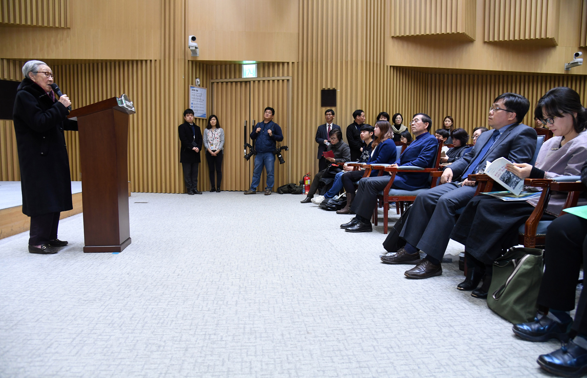 박원순 서울시장과 일본군 위안부 피해자 김복동 할머니가 22일 오후 서울 중구 서울시청에서 열린 문서와 사진 증언으로 보는 위안부 이야기 행사에 참석하며 복도에 전시된 위안부 피해자 작품을 감상하고 있다. 서울시 제공