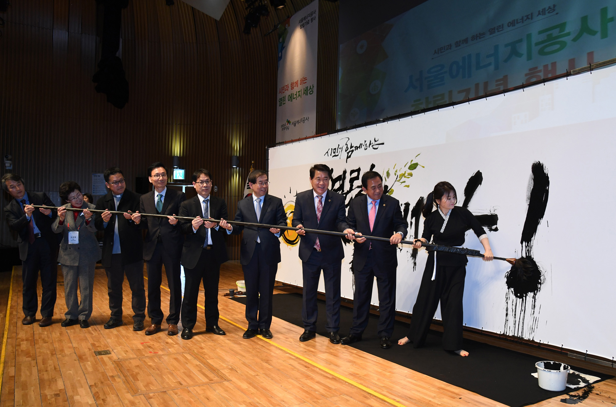 23일 오후 서울시청에서 열린 '서울에너지공사 창립기념식'에 참석한 박원순 서울시장과 박진섭 에너지공사 사장을 비롯한 관계자들이 창립 기념 대형 손글씨를 완성하고 있다. 서울시 제공