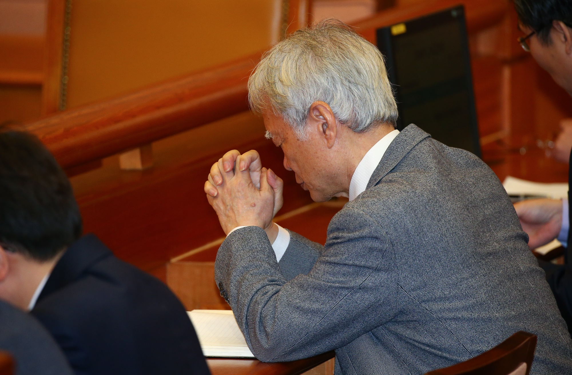 (서울=포커스뉴스) 10일 오전 서울 종로구 헌법재판소에서 열린 박근혜 대통령에 대한 탄핵심판 최종선고기일에 참석한 박 대통령 법률대리인단의 서석구 변호사가 기도하고 있다.