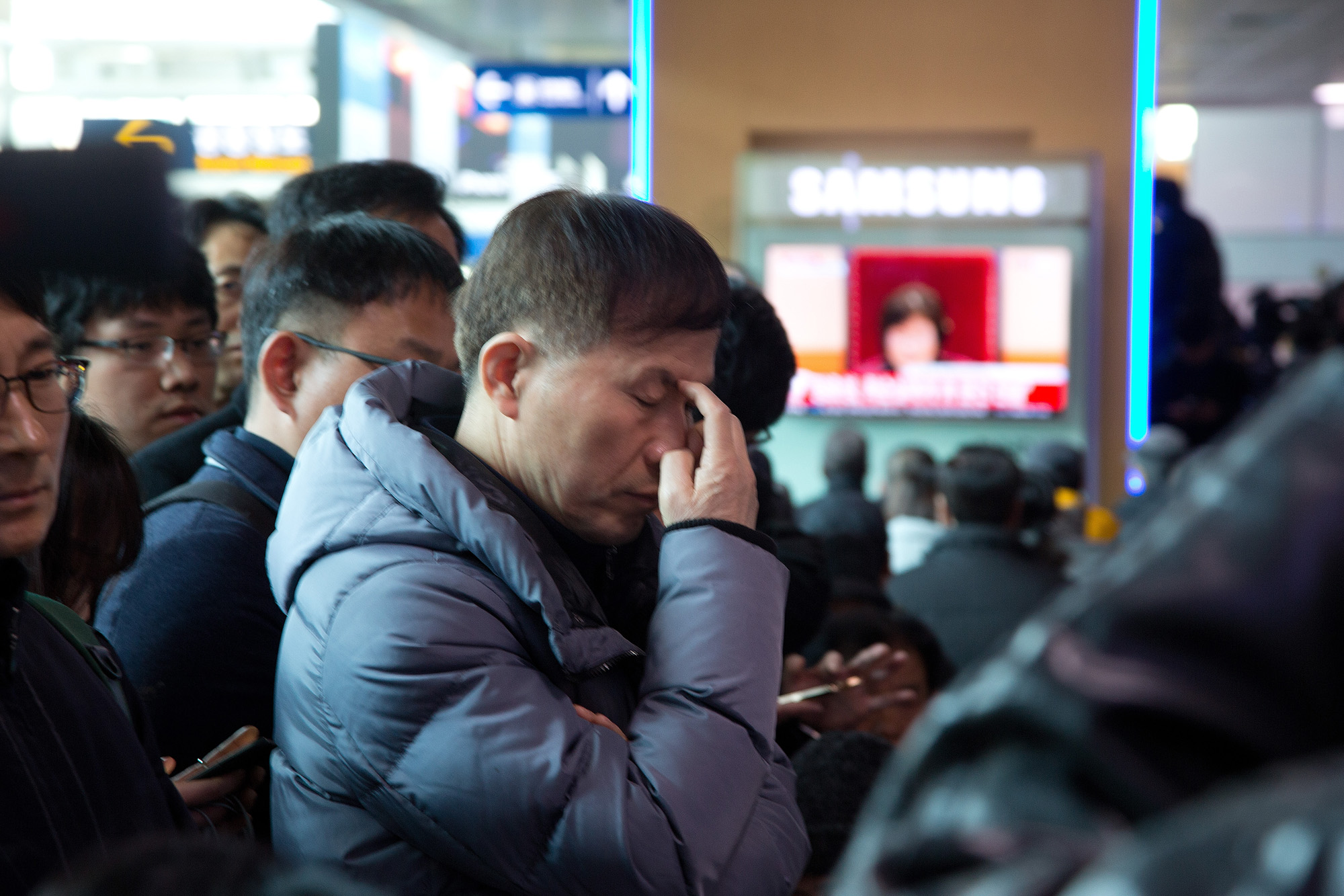 | 사진설명 | [Eoimage=서울] 이종현 기자 = 헌법재판소의 박근혜 대통령 탄핵에 대한 심판이 있는 10일 오전, 서울역 대합실에 비치된 TV에서 선고가 생중계 되자 시민들이 삼삼오오 모여 TV를 신청하고 있다. 2017.03.10. eomaster@eoimage.com |