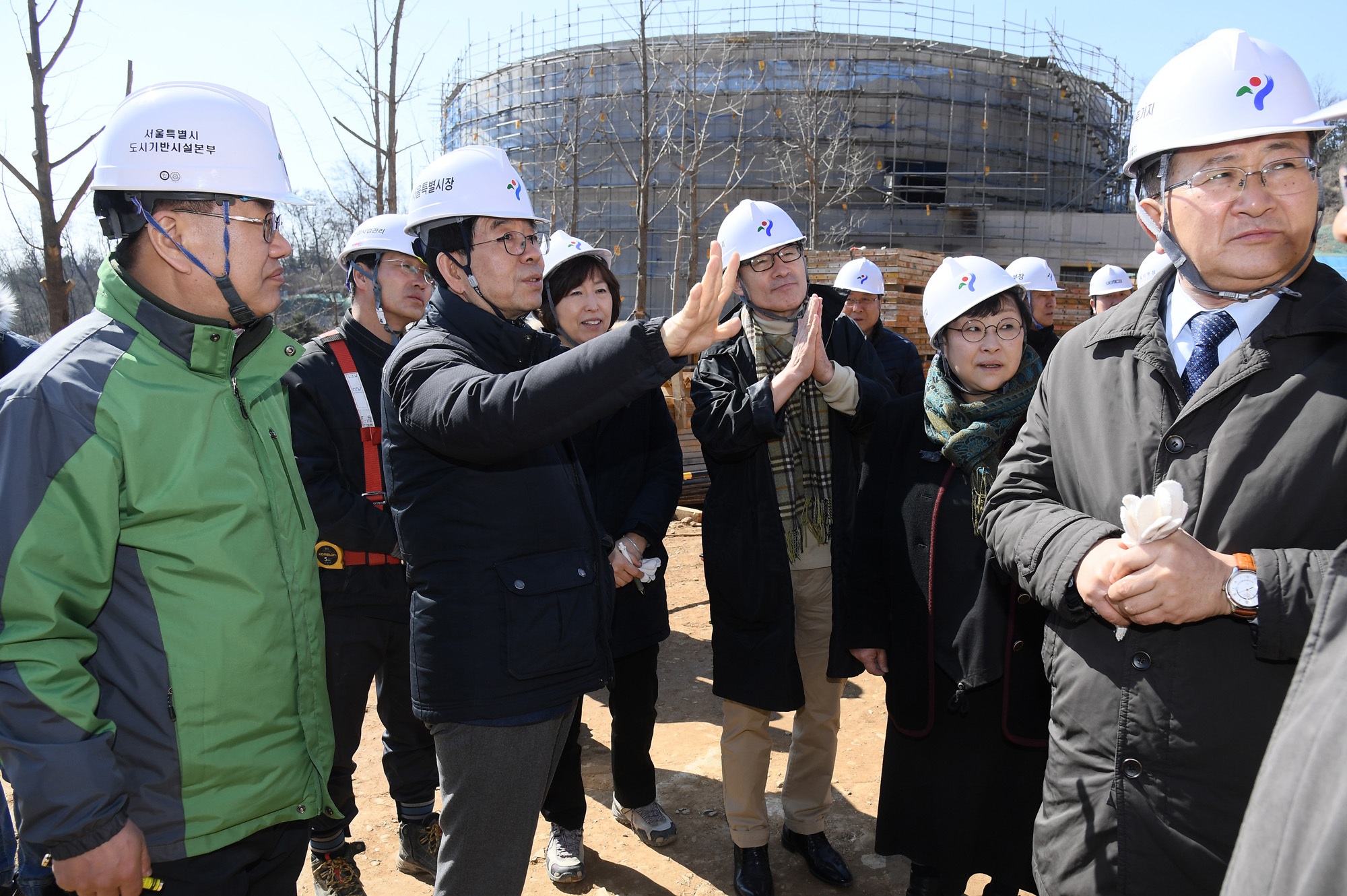 박원순(왼쪽 두번째) 서울시장이 6일 오전 서울 마포구 성산동 문화비축기지 공사현장을 방문해 '마포석유비축기지 재생 및 공원조성공사'에 대한 발언을 하고 있다. 서울시 제공