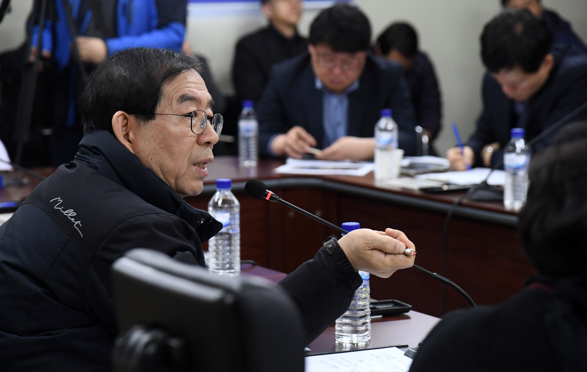 박원순(왼쪽 두번째) 서울시장이 6일 오전 서울 마포구 성산동 문화비축기지 공사현장을 방문해 '마포석유비축기지 재생 및 공원조성공사'에 대한 발언을 하고 있다. 서울시 제공