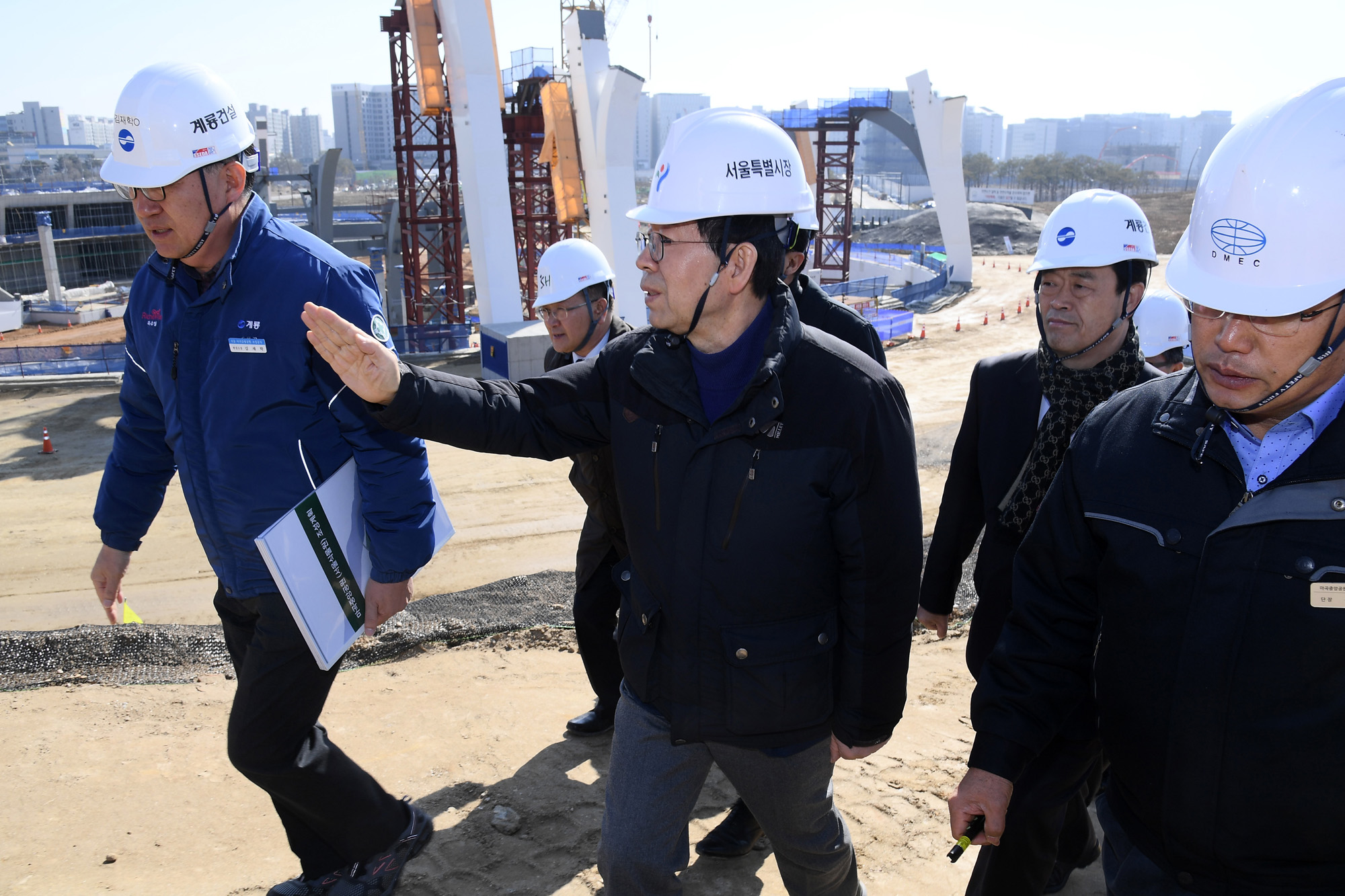 박원순 서울시장이 6일 오전 마곡지구 내 서울식물원(강서구 마곡동 812번지) 공사 현장을 방문, 작업 현황을 보고 받고, 서울식물원의 핵심 관람시설인 '식물문화센터' 공사 현황을 점검했다. 서울시 제공