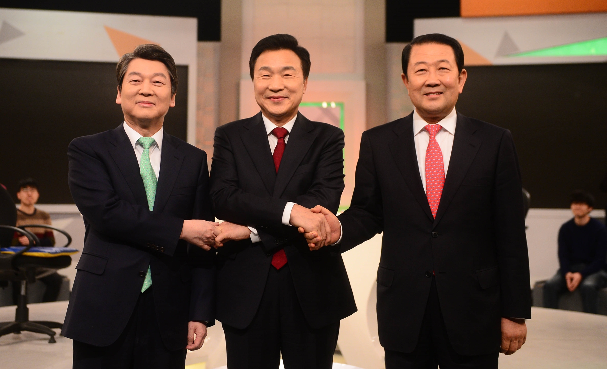 안철수(왼쪽부터) 전 국민의당 대표와 손학규 전 경기지사, 박주선 국회부의장이 18일 오전 서울 영등포구 여의도 KBS 스튜디오에서 열린 'KBS 국민의당 대선후보 경선토론' 시작 전 손을 맞잡고 기념촬영을 하고 있다.2017.3.18 국회사진취재단/뉴시스 추상철