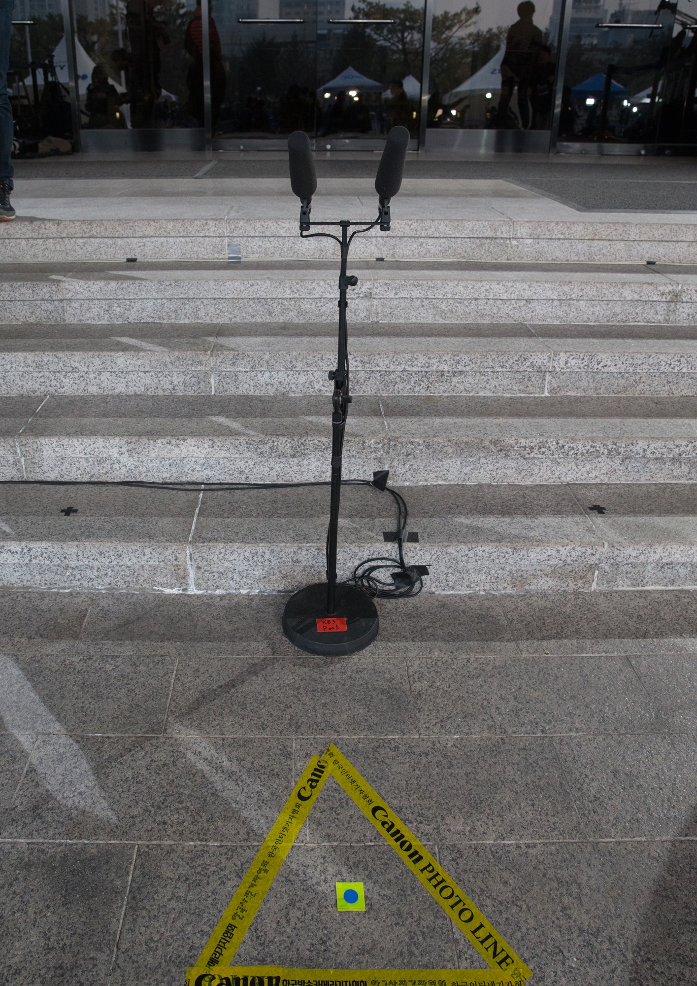 (서울=포커스뉴스) 박근혜 전 대통령 소환을 앞둔 21일 오전 서초구 서울중앙지방검찰청에 마이크와 포토라인이 마련되어 있다.