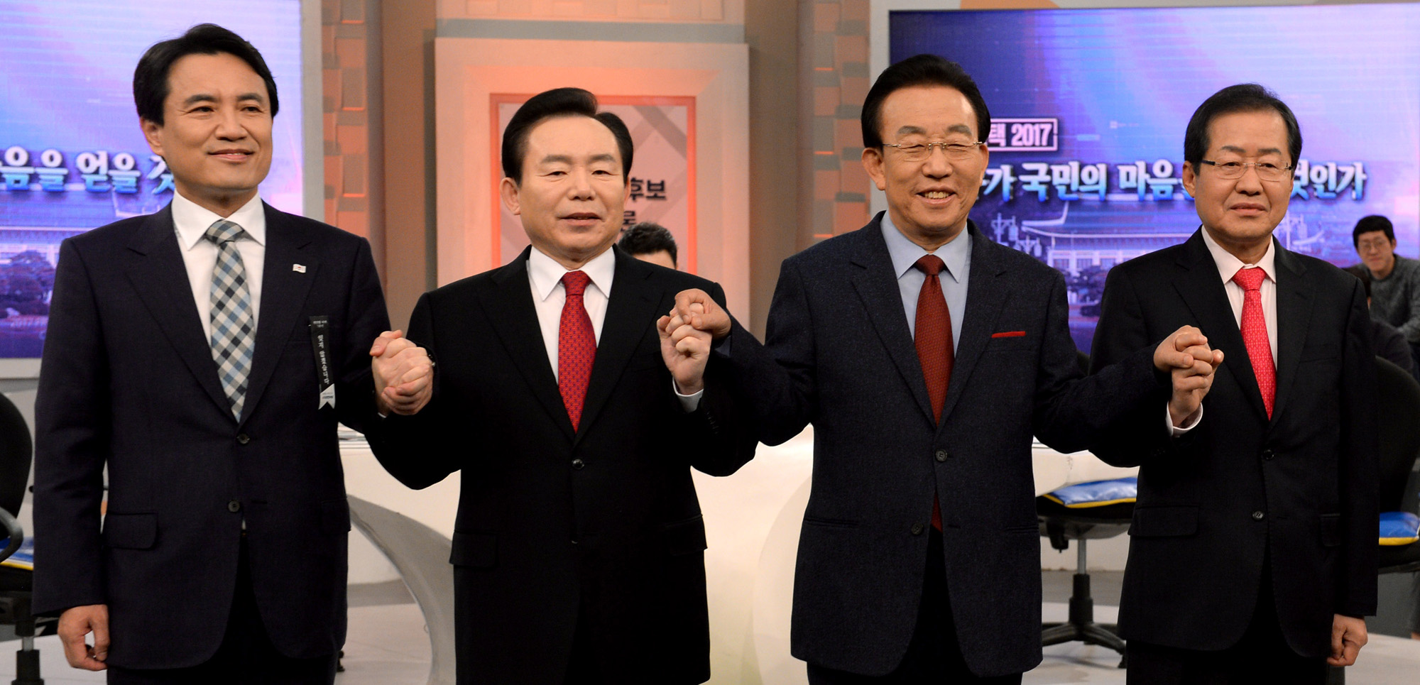 자유한국당 당 대선후보에 도전한 4명의 후보들이 26일 오전 여의도 KBS 스튜디오에서 열린 후보자 경선 토론에 앞서 손을 맞잡고 포즈를 취하고 있다. 왼쪽부터 김진태의원,이인제 전 의원,김관용 경북지사,홍준표 경남지사 /