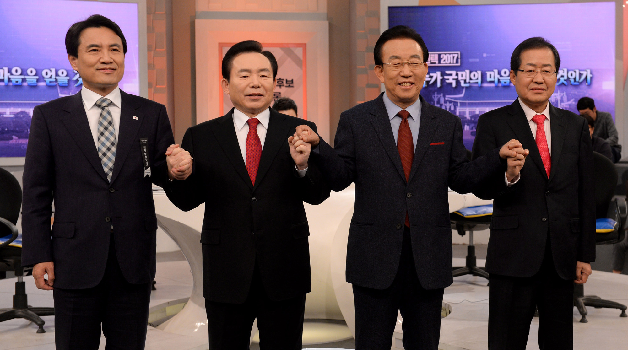 자유한국당 당 대선후보에 도전한 4명의 후보들이 26일 오전 여의도 KBS 스튜디오에서 열린 후보자 경선 토론에 앞서 손을 맞잡고 포즈를 취하고 있다. 왼쪽부터 김진태의원,이인제 전 의원,김관용 경북지사,홍준표 경남지사 /