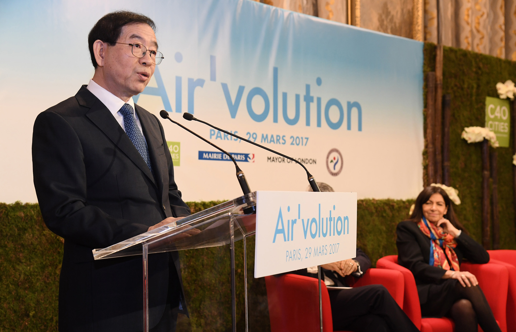유럽을 순방중인 박원순 서울시장은 29일 오전(현지시간) 프랑스 파리시청에서 안 이달고(Anne Hidalgo) 파리 시장(오른쪽), 사디크 칸(Sadiq Khan) 런던 시장과 공동 기자회견을 하고 대기질 혁명을 이끈다고 선언했다. 서울시 제공