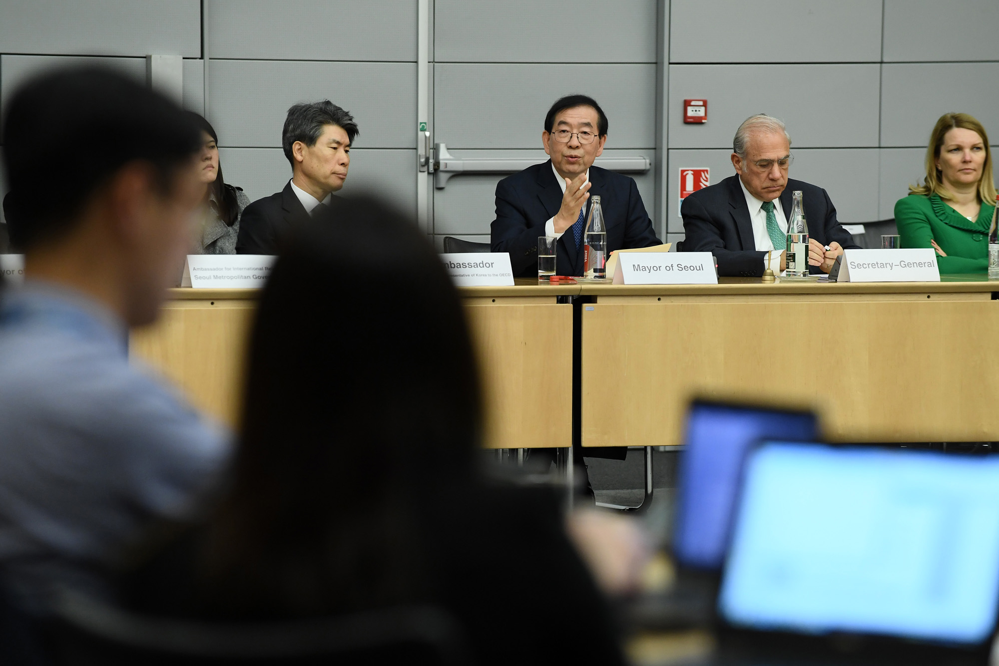 박원순 시장은 29일(현지시간) 프랑스 파리 경제협력개발기구(OECD) 본부에서 모두를 위한 경제 '위코노믹스'에 관한 특강을 OECD 초청으로 앙헬 구리아 사무총장과 OECD 회원국 대사 10여명, 직원 등 200여명을 대상으로 강연했다. 서울시 제공