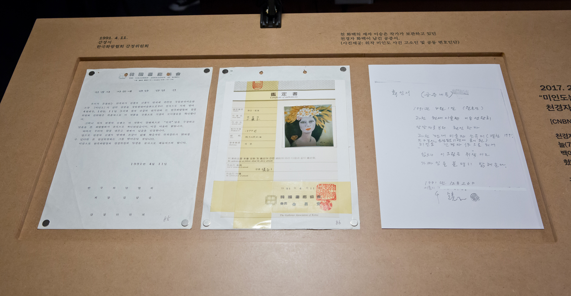 [서울=eoimage] 임준선기자 =18일 오전 경기도 과천시 국립현대미술관에서 열린 고 천경자 화백 미인도 언론공개 행사에서 취재진이 미인도 위작논란 기사 등을 촬영하고 있다.