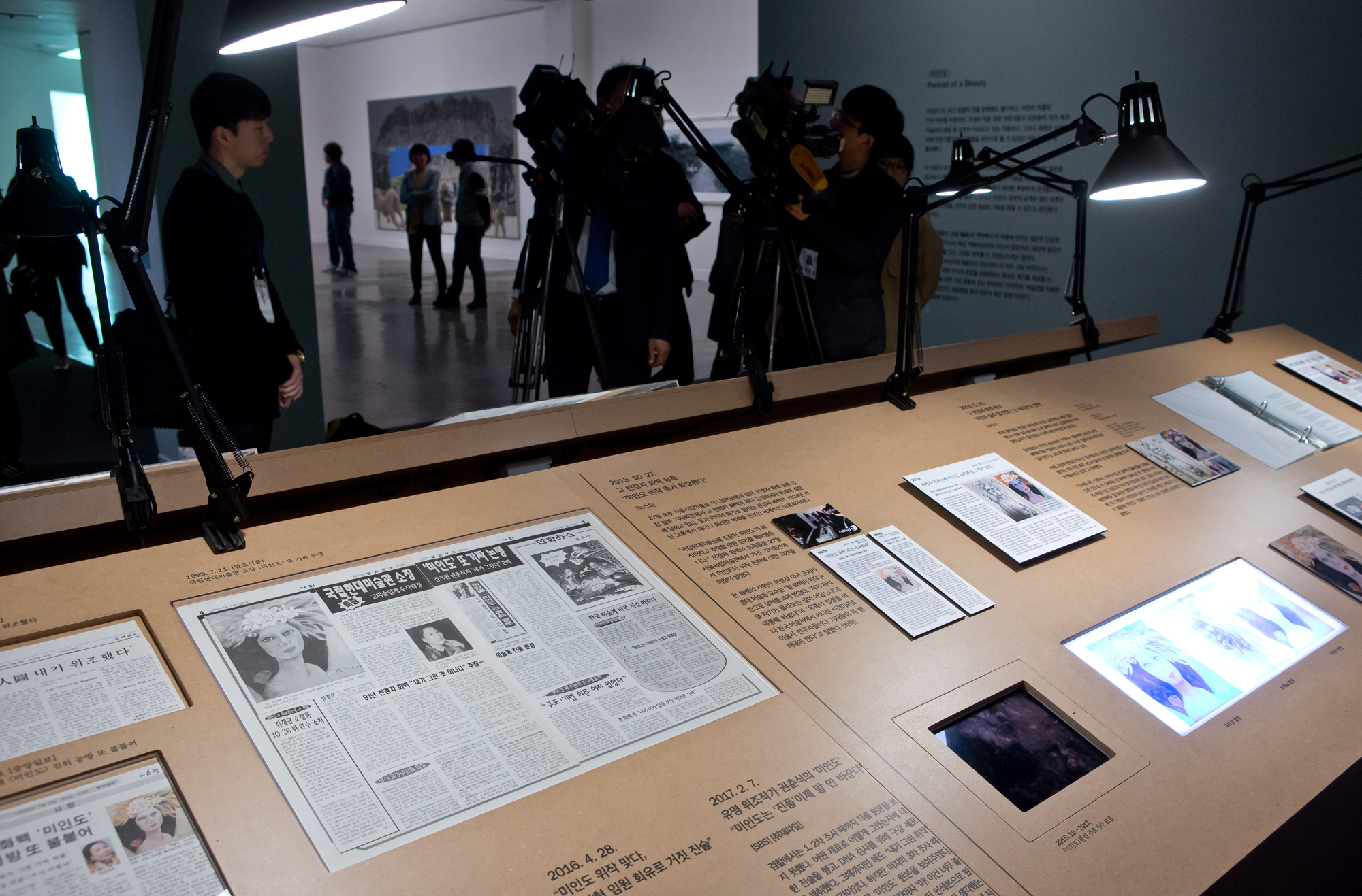 [서울=eoimage] 임준선기자 =18일 오전 경기도 과천시 국립현대미술관에서 열린 고 천경자 화백 미인도 언론공개 행사에서 취재진이 미인도 위작논란 기사 등을 촬영하고 있다.