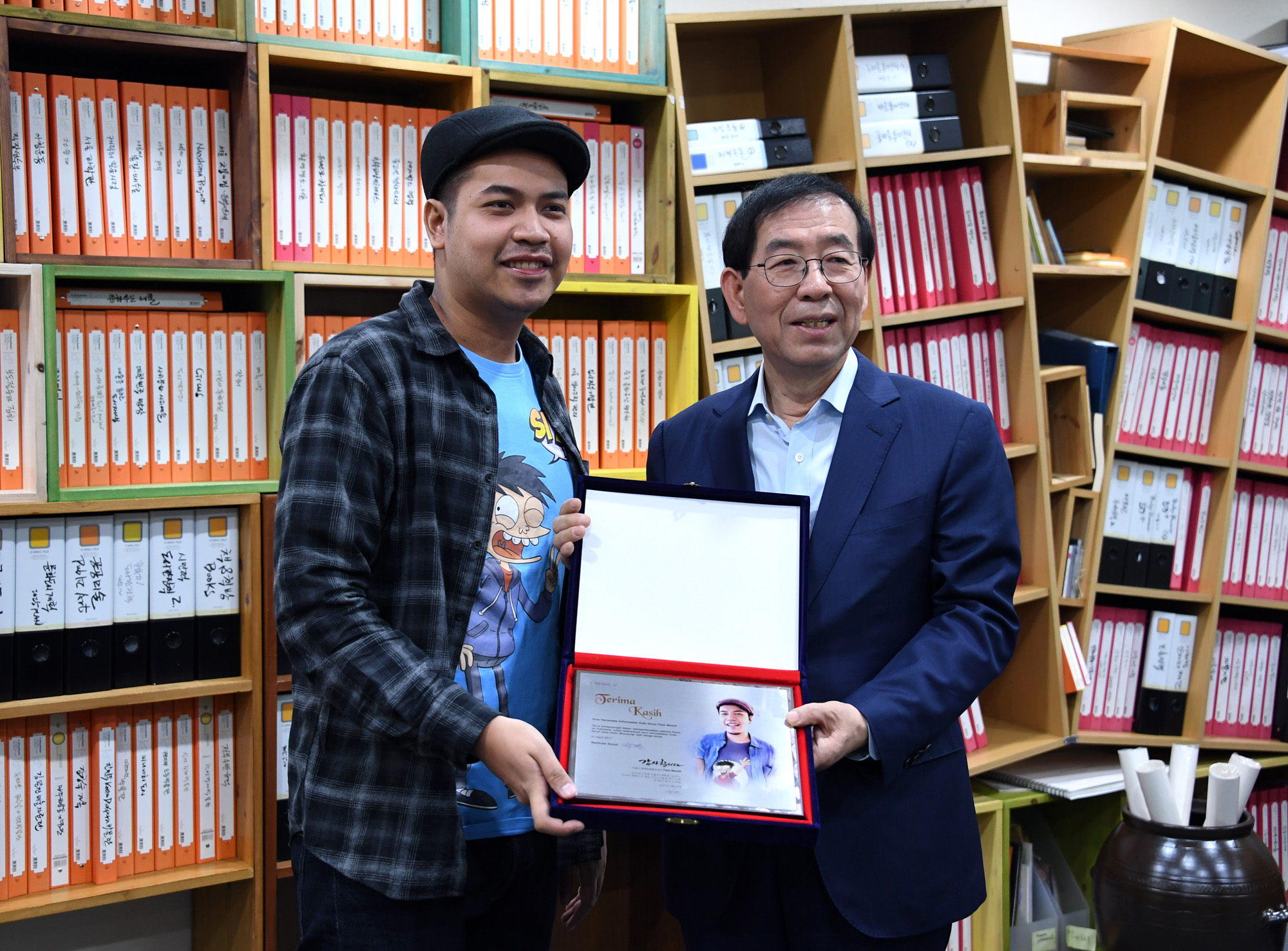 인도네시아 국민 웹툰 작가인 파자 메온(Faza Meonk)이 21일 오전 서울시청에서 열린 서울시 명예관광홍보대사 위촉식에서 박원순 서울시장과 대화를 나누고 있다. 서울시 제공