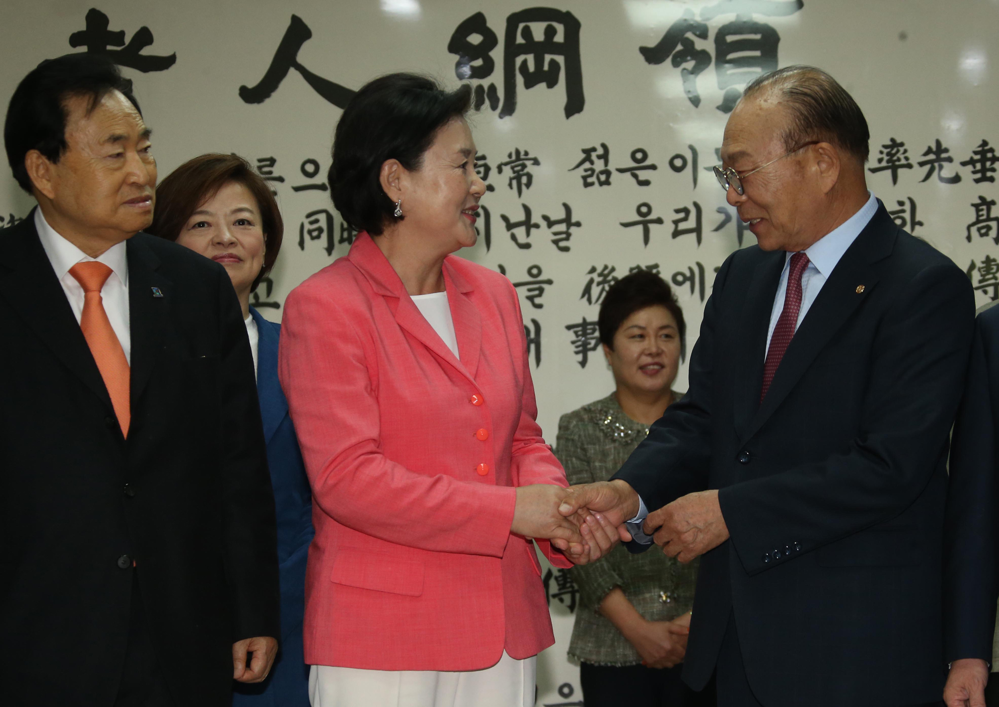 문재인 더불어민주당 후보의 부인 김정숙씨가 25일 오후 서울 용산구 효창동 대한노인회를 방문해 이심 회장과 면담한 뒤 회관을 나서며 이 회장의 배웅을 받고 있다. 2017.04.25 사진/임준선기자