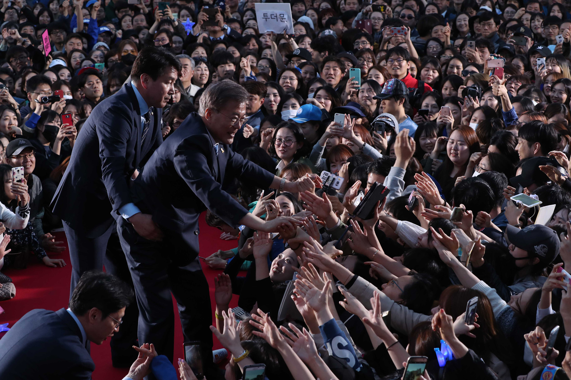 [성남=eoimage]박정훈기자=더불어민주당 문재인 대선후보가 27일 오후 경기도 성남시 분당구 야탑역 광장에서 열린 집중유세에서 유권자에게 지지를 호소하고 있다.