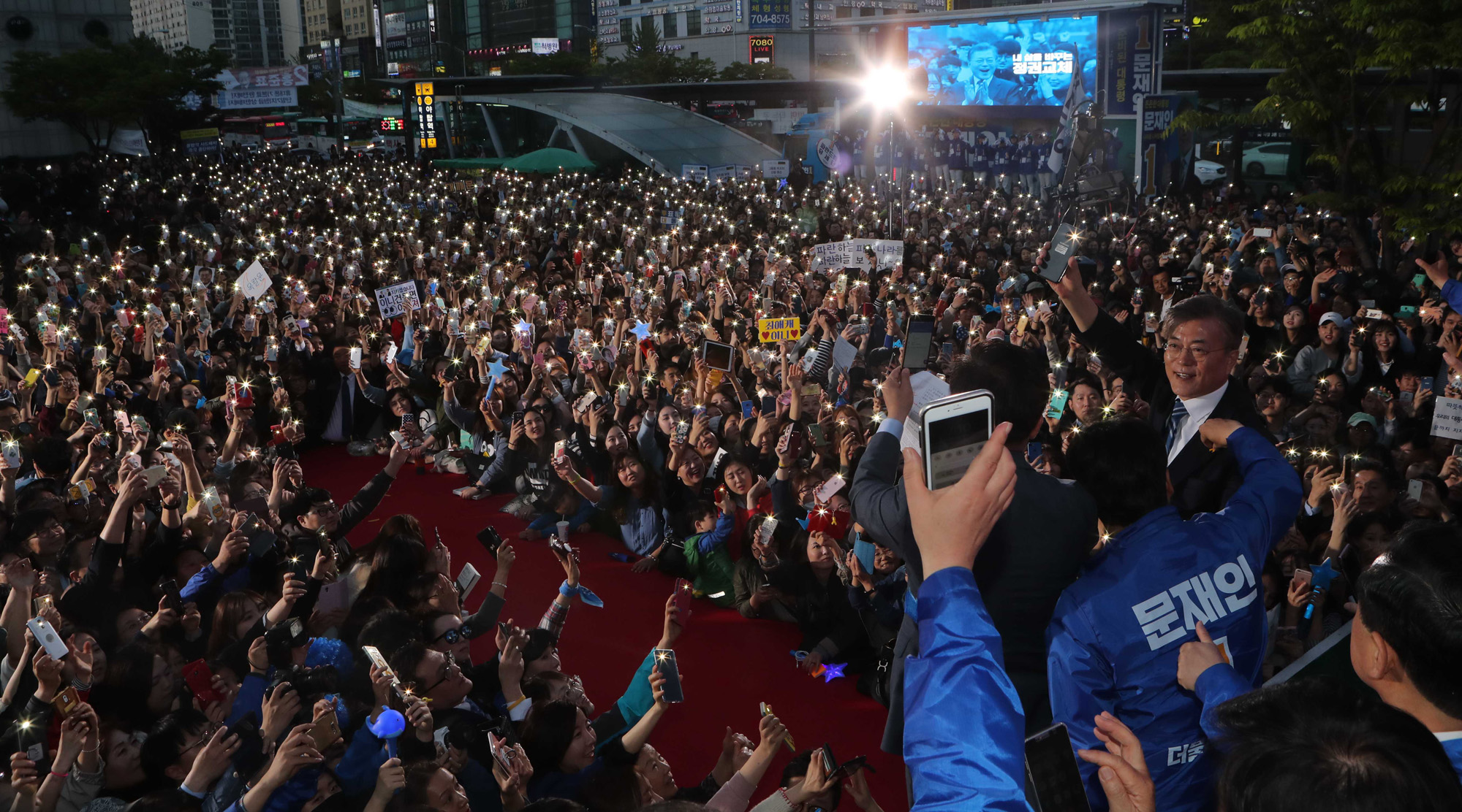 [성남=eoimage]박정훈기자=더불어민주당 문재인 대선후보가 27일 오후 경기도 성남시 분당구 야탑역 광장에서 열린 집중유세에서 유권자에게 지지를 호소하고 있다.
