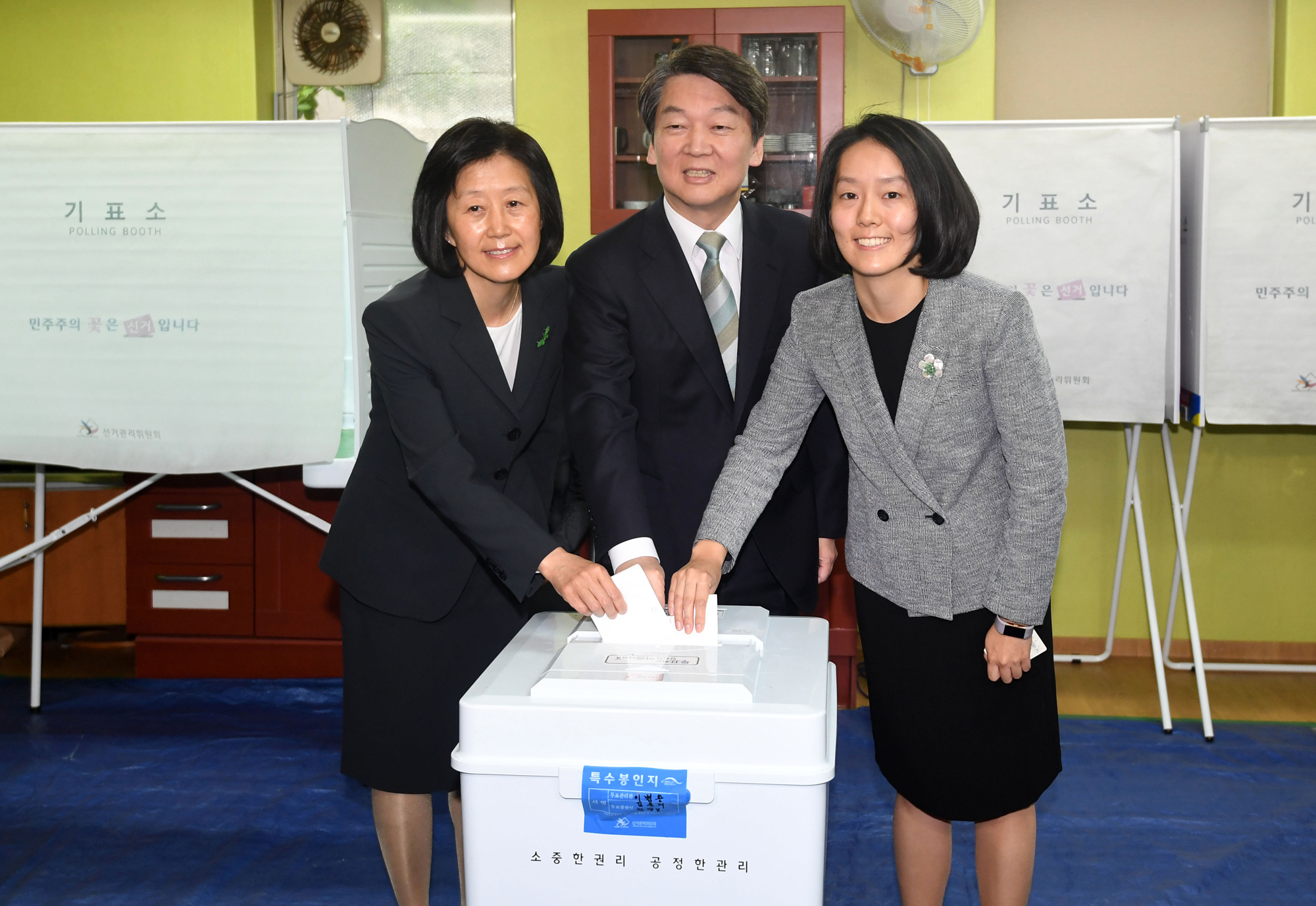 국민의당 안철수 후보가 19대 대선 투표일인 9일 오전 서울 노원구 극동늘푸른아파트 경로당에서 부인 김미경 교수(왼쪽)와 딸 안설희 씨(오른쪽)와 투표를 하고 있다.2017.05.09 사진/임준선기자(현장풀)