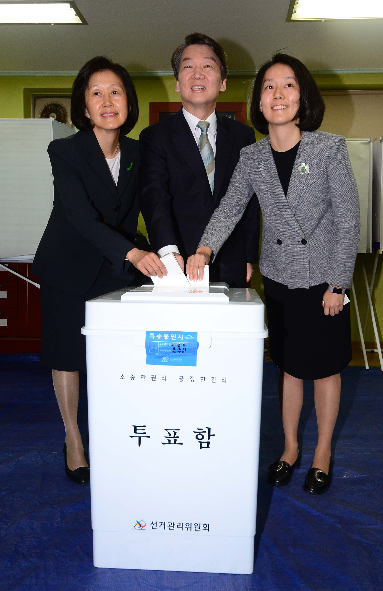 안철수 국민의당 대선후보(가운데)가 제19대 대통령선거일인 9일 서울 노원구 상계동 제7투표소에서 아내 김미경씨(왼쪽), 딸 설희씨(오른쪽)와 함께 투표하고 있다./2017.05.09 사진/임준선기자(현장풀)