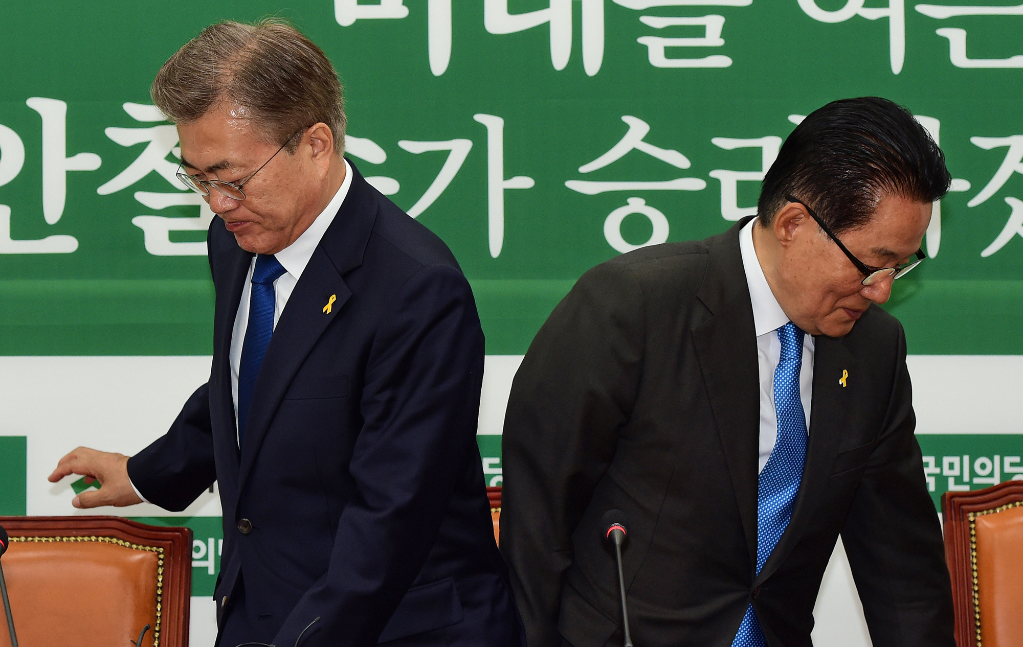 아시아투데이 송의주 기자 = 문재인 대통령(왼쪽)이 10일 서울 여의도 국회 국민의당 당대표실을 찾아 박지원 대표를 예방한 뒤 자리를 나서고 있다.2017.05.10 국회사진취재단