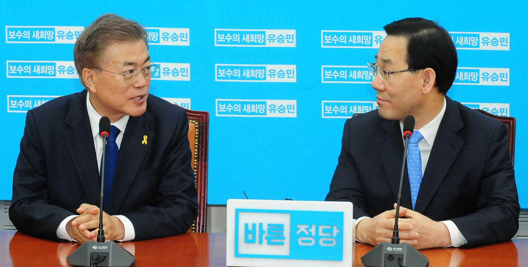 문재인 대통령(왼쪽)이 바른정당 주호영 원내대표와 10일 오전 서울 국회에서 대화를 하고 있다.2017.05.10 국회사진취재단