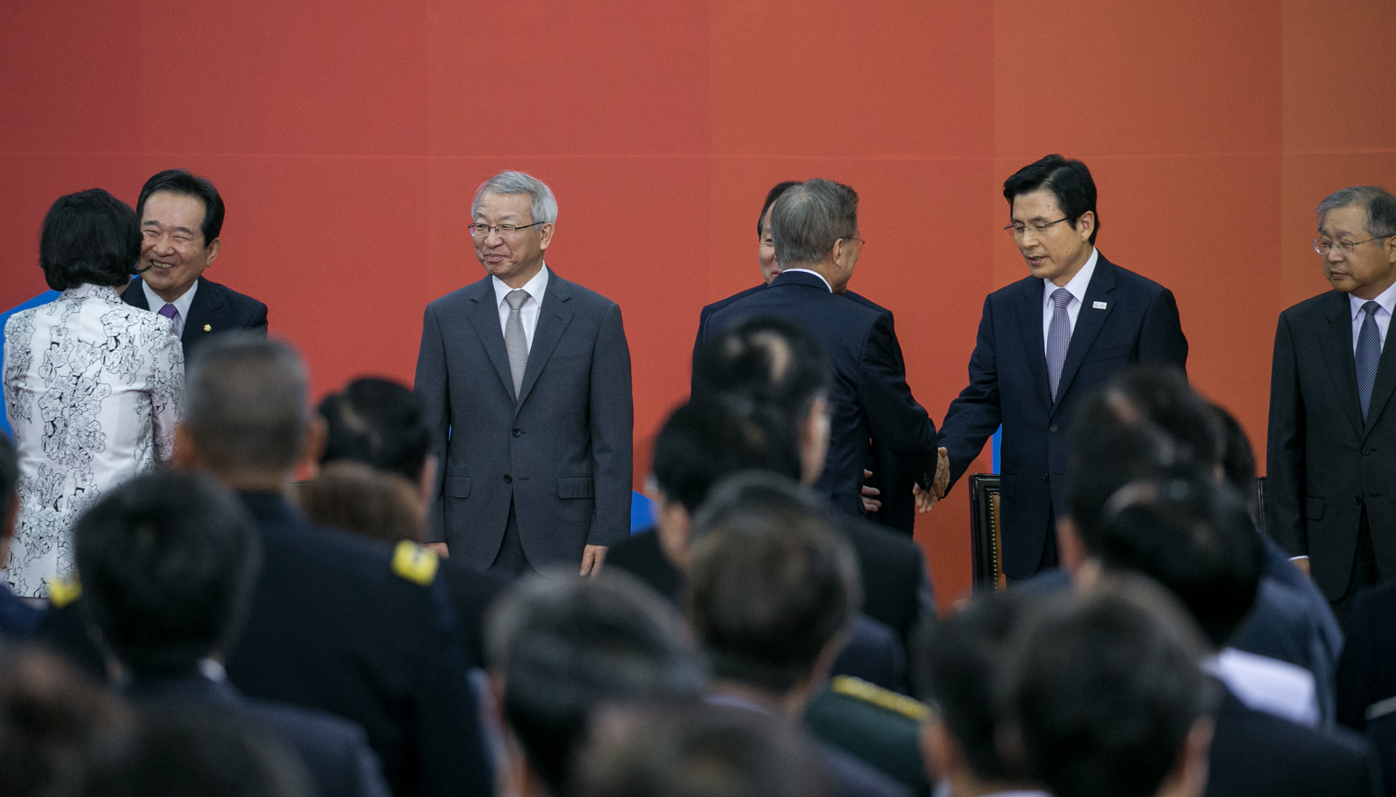 문재인 대통령이 10일 오후 서울 여의도 국회의사당 로텐더홀에서 열린 취임식에 참석해 황교안 국무총리와 악수하고 있다.2017.05.10 국회사진취재단