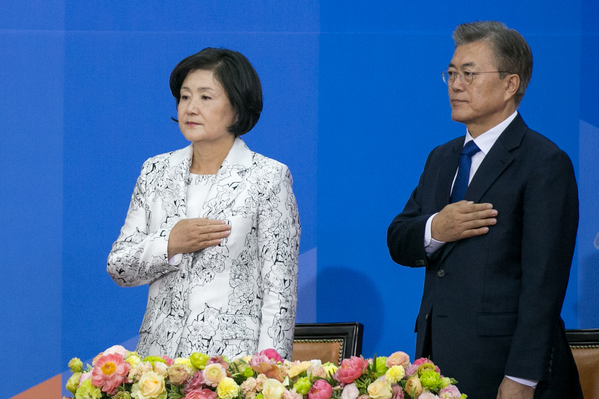 문재인 대통령과 영부인 김정숙 여사가 10일 오후 서울 여의도 국회의사당 로텐더홀에서 열린 취임식에 참석해 국민의례하고 있다.2017.05.10 국회사진취재단