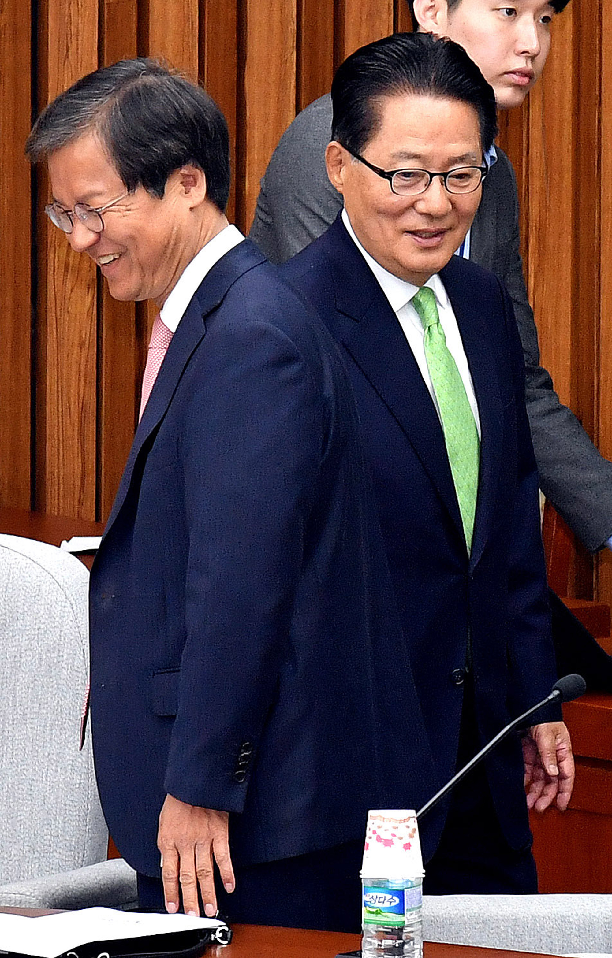 [eoimage=서울] 박은숙 기자 = 당대표직 사퇴 의사를 밝힌 국민의당 박지원 대표가 11일 오전 서울 여의도 국회 본청에서 열린 최고위원-국회의원 연석회의에 참석하며 천정배의원과 대화를 나누고 있다. 2017. 5. 11.eomaster@eoimage.com