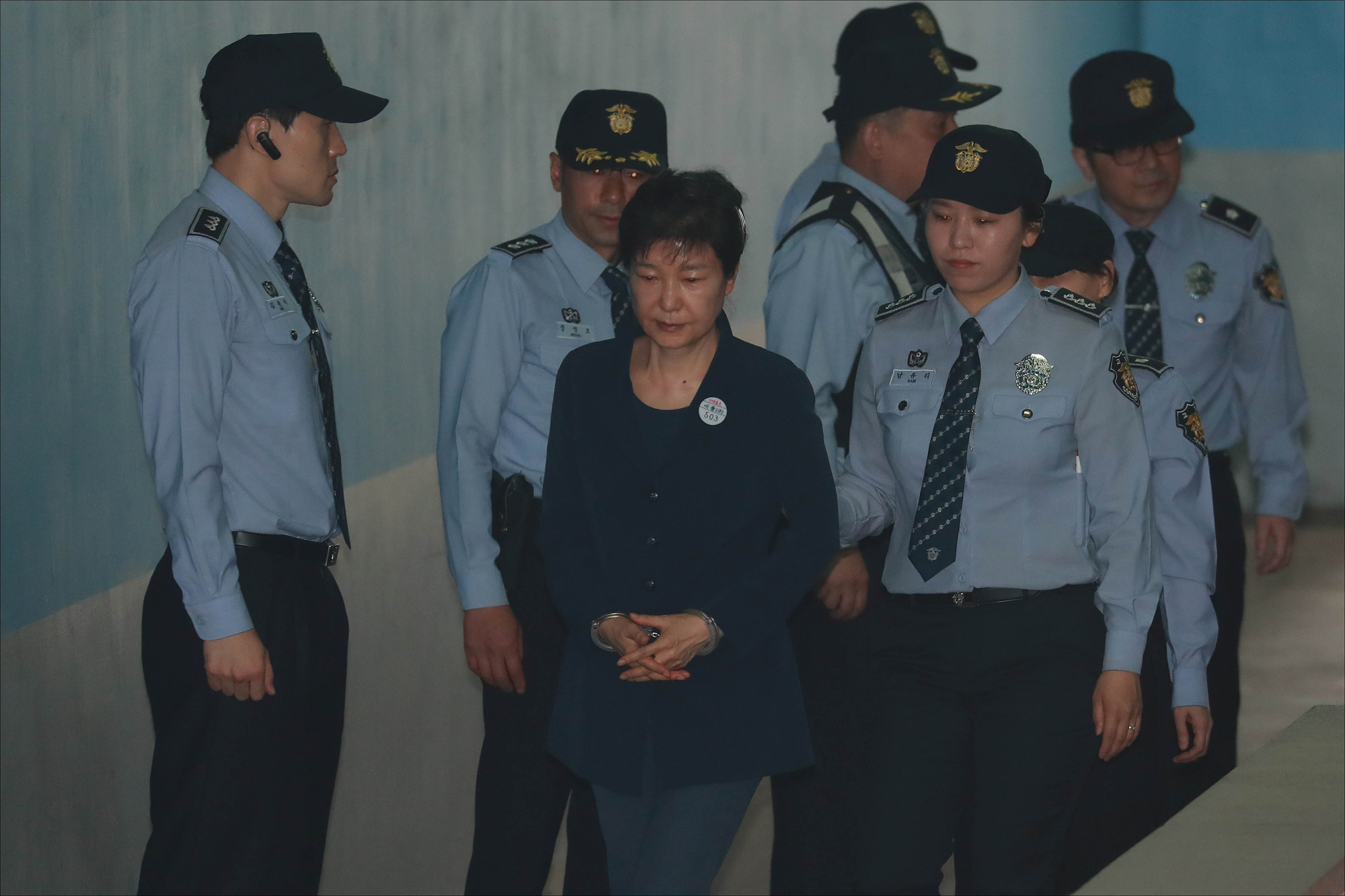 비선실세 최순실 사태로 파면 후 기소된 박근혜가 23일 오전 서울 서초구 서울중앙지방법원에서 열린 첫 공판에 출석하기 위해 호송차량에서 내려 법원 청사로 들어가고 있다.