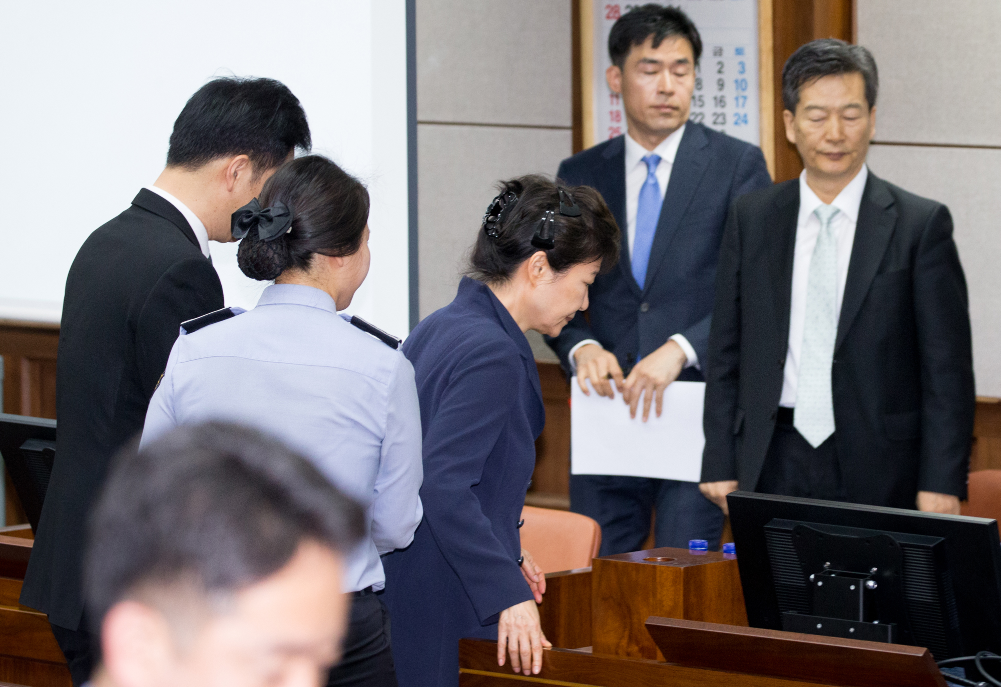박근혜 전 대통령이 23일 오전 서초구 서울중앙지방법원에서 592억 원대 뇌물 수수 혐의 등에 대한 첫 정식재판에 참석해 자리하고 있다.