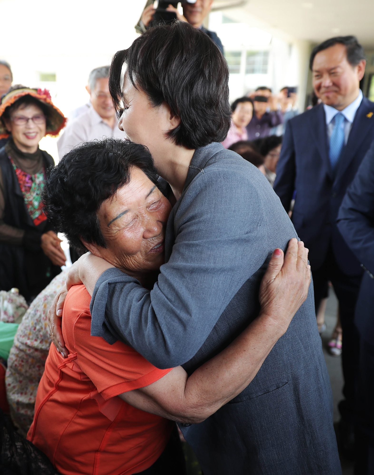 광주 북구 효령동에 위치한 효령노인복지타운에 문재인대통령 부인 김정숙여사가 방문해 약속을 지키는 문재인정부 효도하는 대한민국이 되겠다고 어르신들께 인사를 하고 있다.