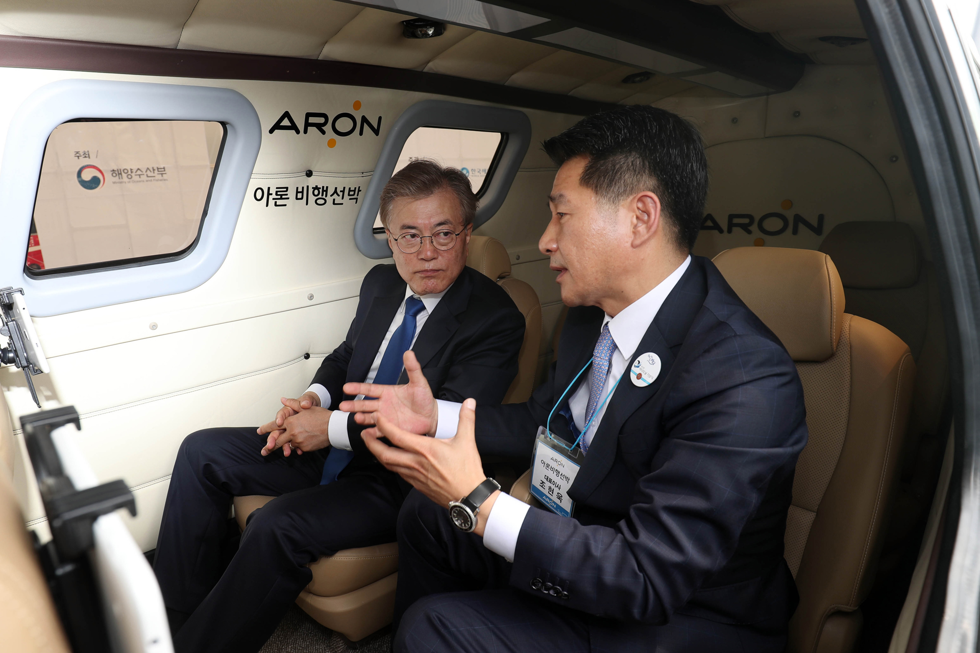 문재인 대통령이 31일 오전 전북 군산시 새만금 신시광장에서 열린 제22회 바다의 날 행사를 마친 뒤 고속선인 아론 위그선에 탑승해 관계자의 설명을 듣고 있다.2017.5.31