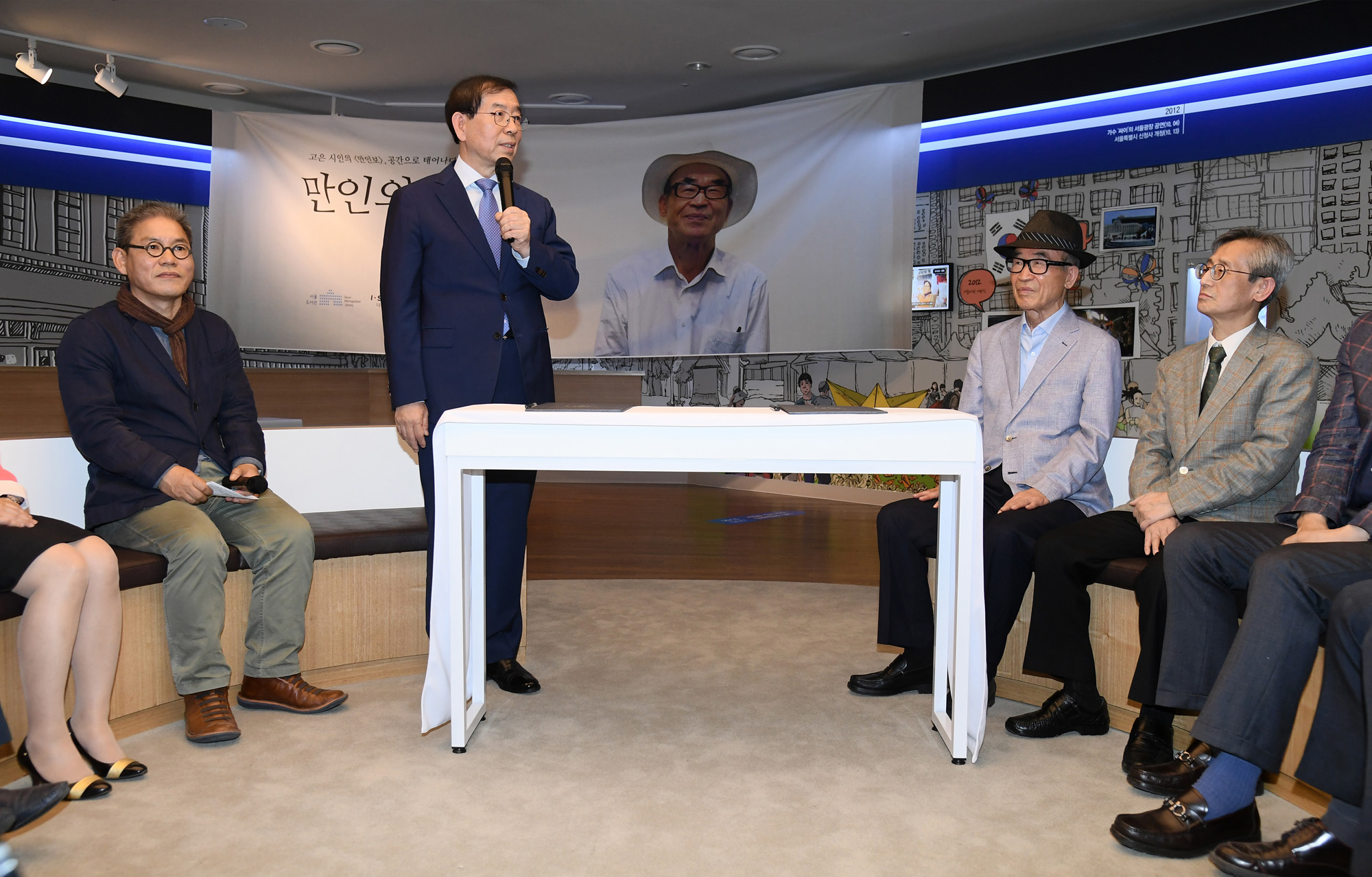 박원순 서울시장이 16일 오후 서울 중구 서울도서관에서 열린 고은 시인 '만인의 방' 조성 및 작품 등 기증 업무 협약식에서 인사말을 하고 있다. 서울시 제공