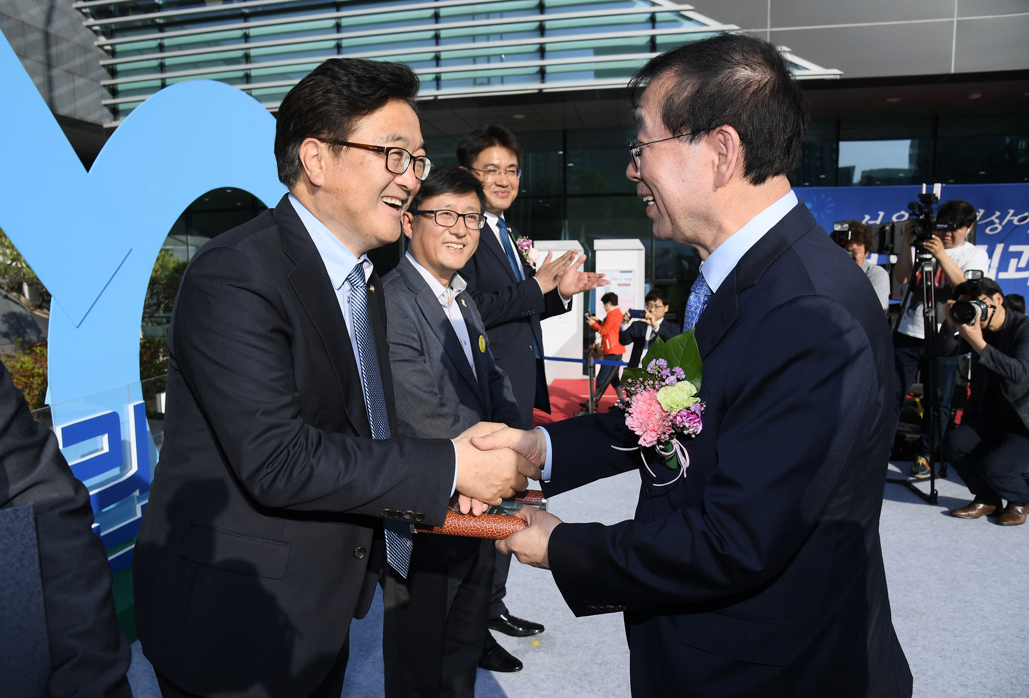 19일 오후 서울 노원구에 새로 개관하는 '서울시립과학관 개관식'에서 박원순 서울시장을 비롯한 참석자들과 제막을 하고 있다. 서울시 제공