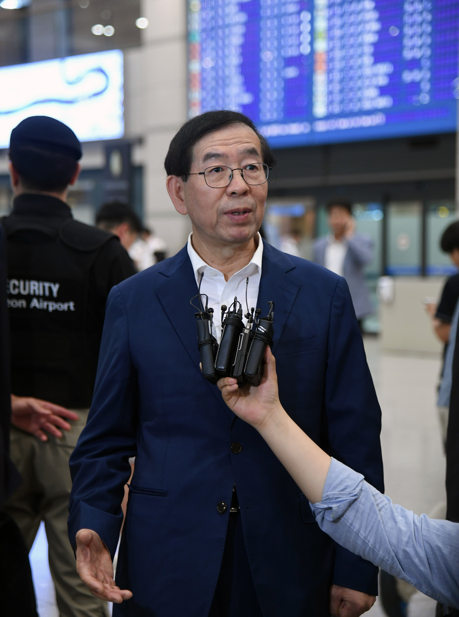 문재인 대통령의 아세안 특사인 박원순 서울시장이 26일 오후 순방 일정을 모두 마치고 인천공항을 통해 귀국하며 취재진의 질문에 답하고 있다. 서울시 제공