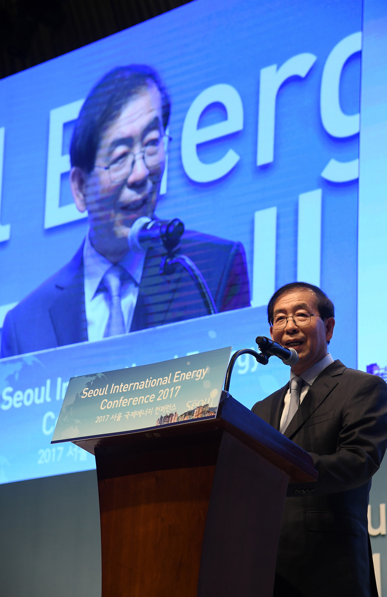 박원순 서울시장이 31일 서울시청에서 열린 서울국제에너지콘퍼런스에서 특별연설하고 있다. 서울시 제공