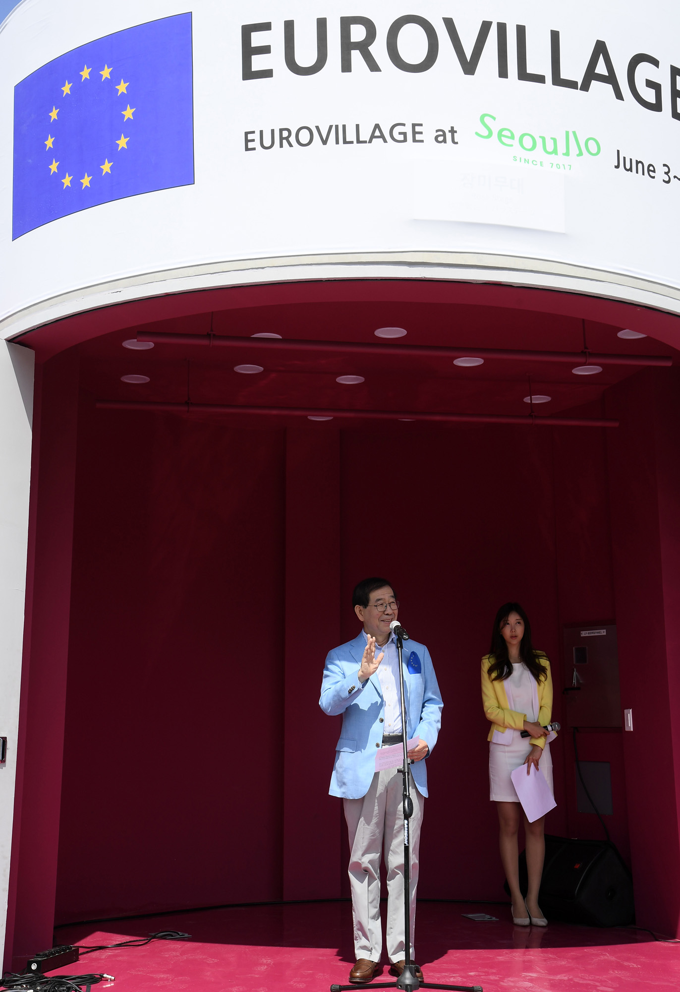 박원순 서울시장 3일 오전 서울 중구 서울로7017에서 열린 '유로빌리지' 개막식에서 인사말을 하고 있다. 서울시 제공