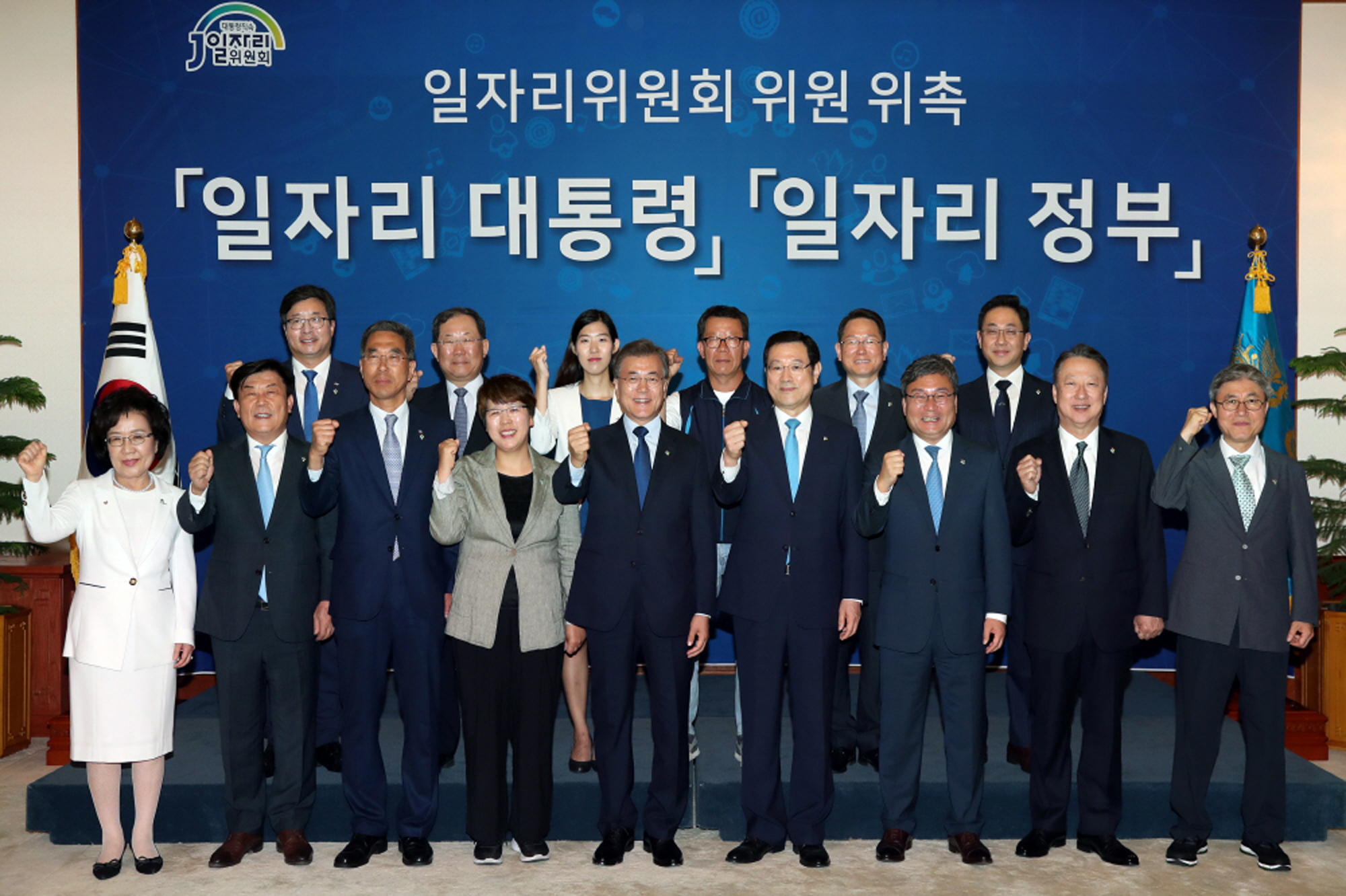 문재인 대통령이 21일 청와대 본관에서 일자리위원회 위촉장 수여식에서 수여식을 마치고 기념촬영을 하며 '일자리 화이팅'을 외치고 있다. (뒷줄왼쪽부터)염태영 수원시장, 박병원 경총회장, 문유진 청년네트워크대표, 최종진 민노총부위원장, 김원석 농협경제지주대표, 안건준 벤처기업협회장, (앞쪽왼쪽부터)이명혜 YWCA연합회장, 박성택 중기중앙회장, 김주영 한국노총위원장, 김영순 여성단체대표, 문재인 대통령, 이용섭 일자리위원회부위원장, 이상직 이스타항공회장, 박용만 상의회장, 조돈문 비정규직대표 2017.6.21 사진/ 청와대제공 |