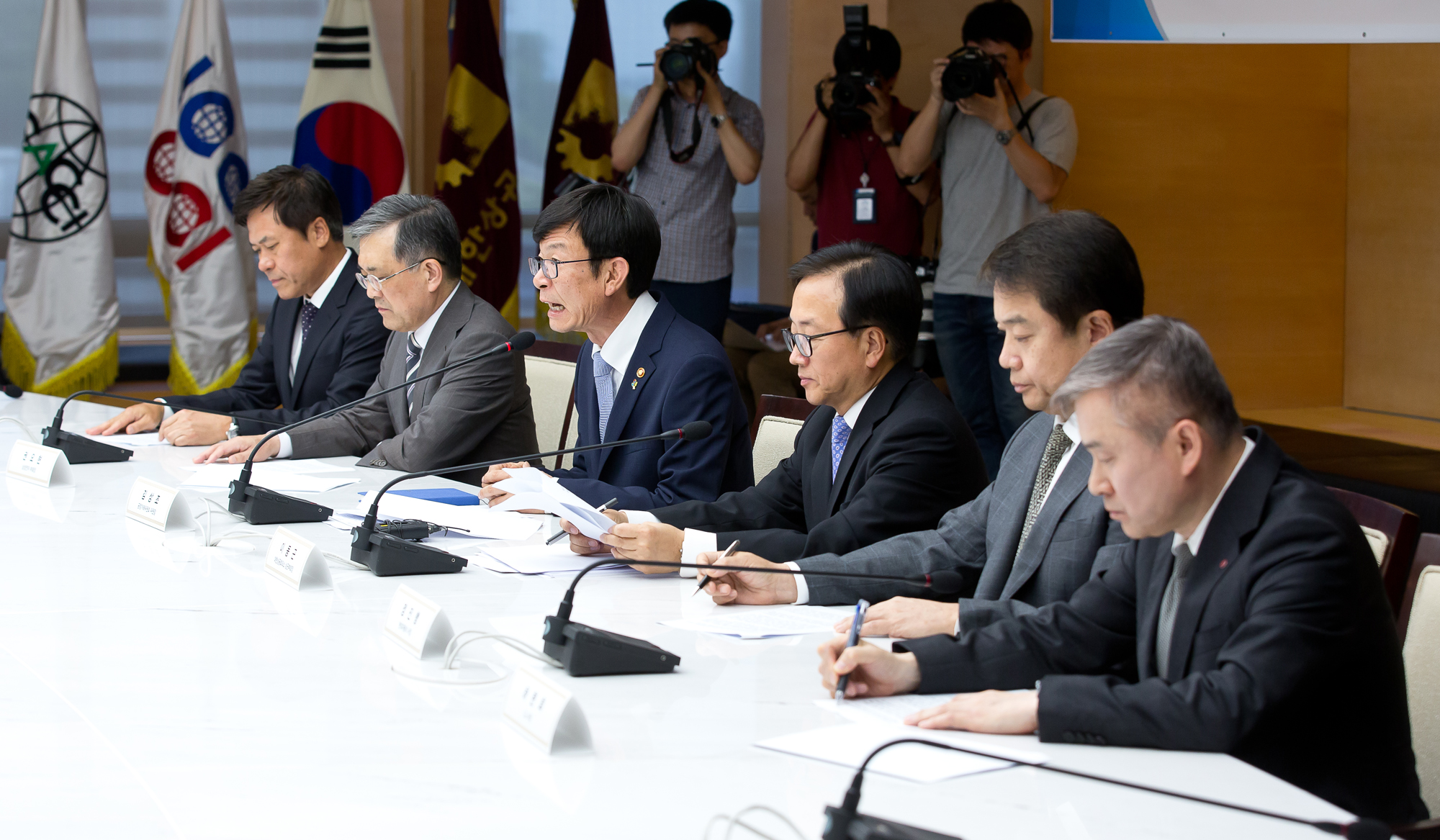[서울=eoimage] 임준선 기자 =김상조 공정거래위원장과 4대그룹 임원들이 23일 서울 중구 대한상공회의소에서 열린 정책간담회에서 참석했다. 박정호 SK 수펙스추구협의회 커뮤니케이션위원장, 권오현 삼성전자 부회장, 김상조 위원장, 정진행 현대자동차 사장, 하현회 LG 사장, 이동근 대한상공회의소 상근부회장. 2017.06.23 |
