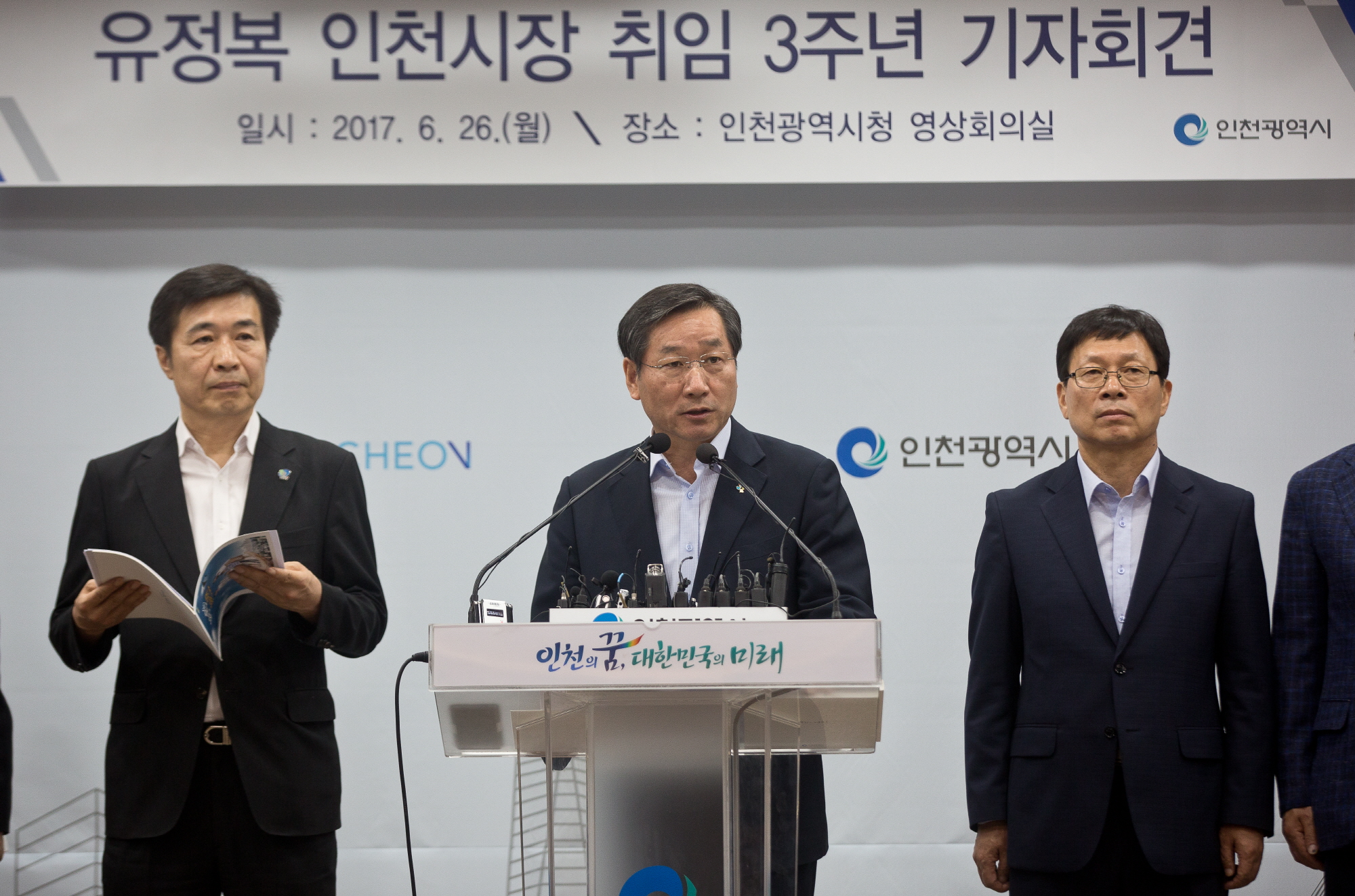 [인천=eoimage] 고성준 기자 = 유정복 인천시장이 26일 오전 경기도 인천시청에서 열린 '취임 3주년 기자간담회'에 참석하고 있다. 2017.6.26 eomaster@eoimage.co.kr
