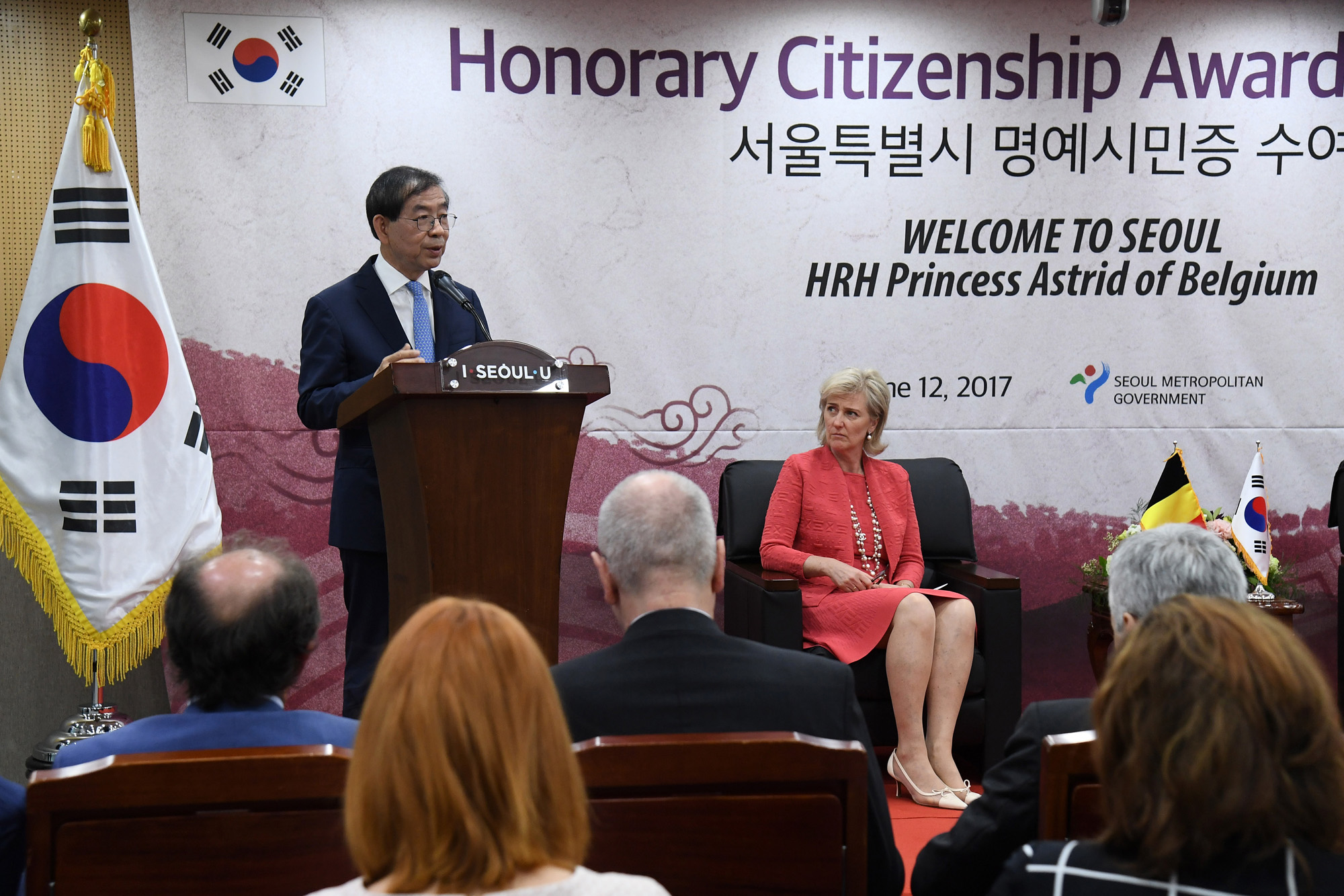 12일 오후 서울 중구 서울시청에서 열린 아스트리드 벨기에 공주 서울시 명예시민증 수여식에서 박원순(오른쪽) 서울시장과 명예시민증을 수여받은 공주가 함께 기념촬영을 하고 있다. 서울시 제공