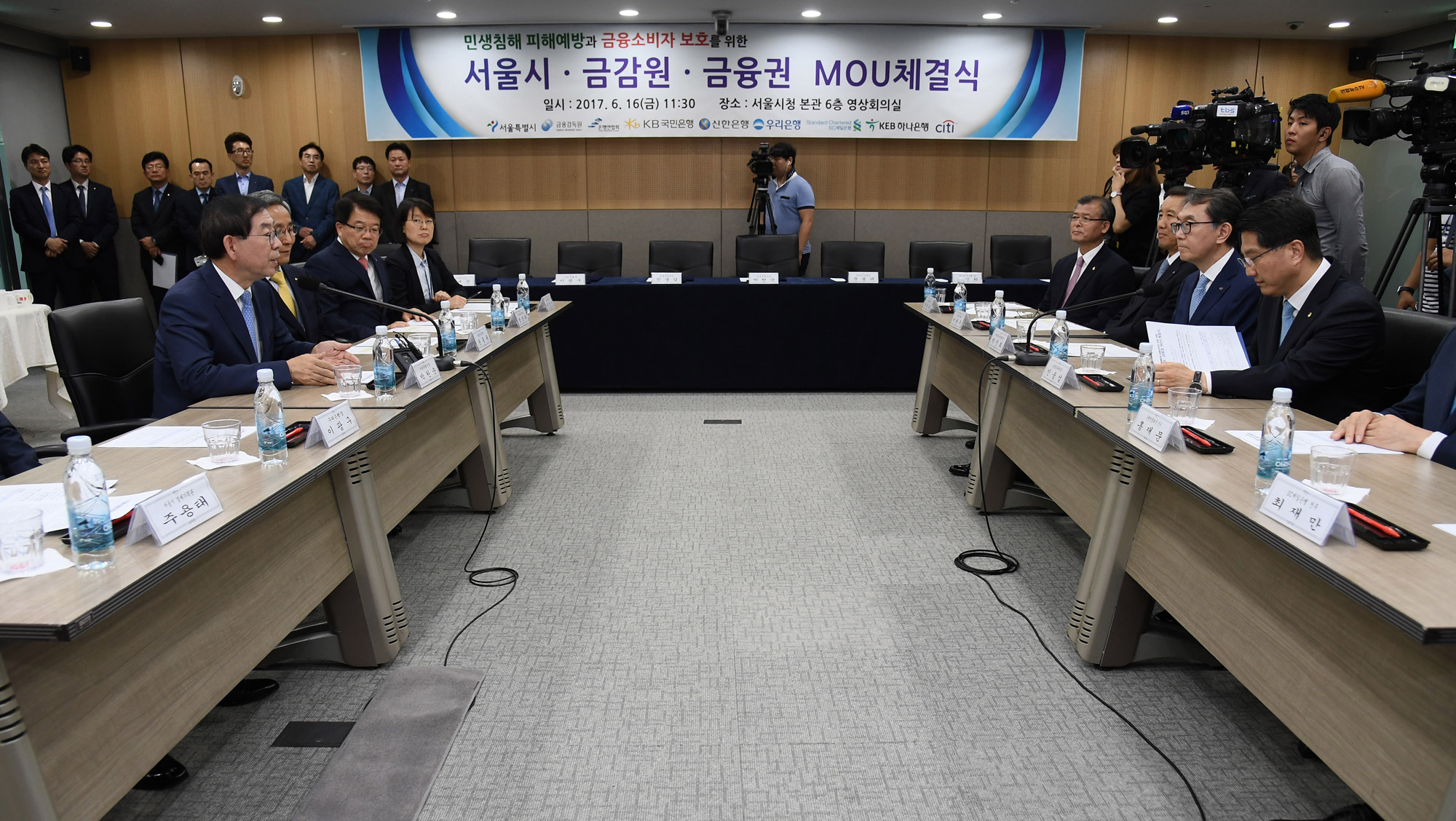 | 사진설명 | 16일 서울시청에서 열린 민생침해 피해예방과 금융소비자 보호를 위한 '서울시·금감원·금융권 업무체결식'에서 참석자들이 협약서에 서명한 뒤 기념촬영을 하고 있다. 오른쪽 부터 최재만 SC제일은행 전무, 서현주 신한은행 부행장, 박진희 씨티은행장, 윤종규 KB국민은행장, 박원순 서울시장, 진웅섭 금융감독원장, 이광구 우리은행장, 홍재문 은행연합회 전무, 정정희 KEB하나은행 부행장. 서울시 제공 |