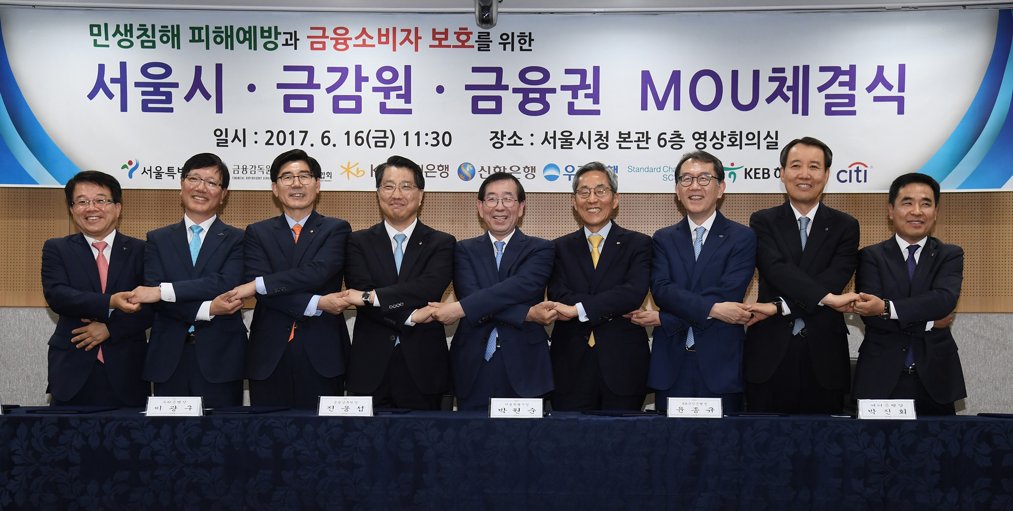 | 사진설명 | 16일 서울시청에서 열린 민생침해 피해예방과 금융소비자 보호를 위한 '서울시·금감원·금융권 업무체결식'에서 참석자들이 협약서에 서명한 뒤 기념촬영을 하고 있다. 오른쪽 부터 최재만 SC제일은행 전무, 서현주 신한은행 부행장, 박진희 씨티은행장, 윤종규 KB국민은행장, 박원순 서울시장, 진웅섭 금융감독원장, 이광구 우리은행장, 홍재문 은행연합회 전무, 정정희 KEB하나은행 부행장. 서울시 제공 |