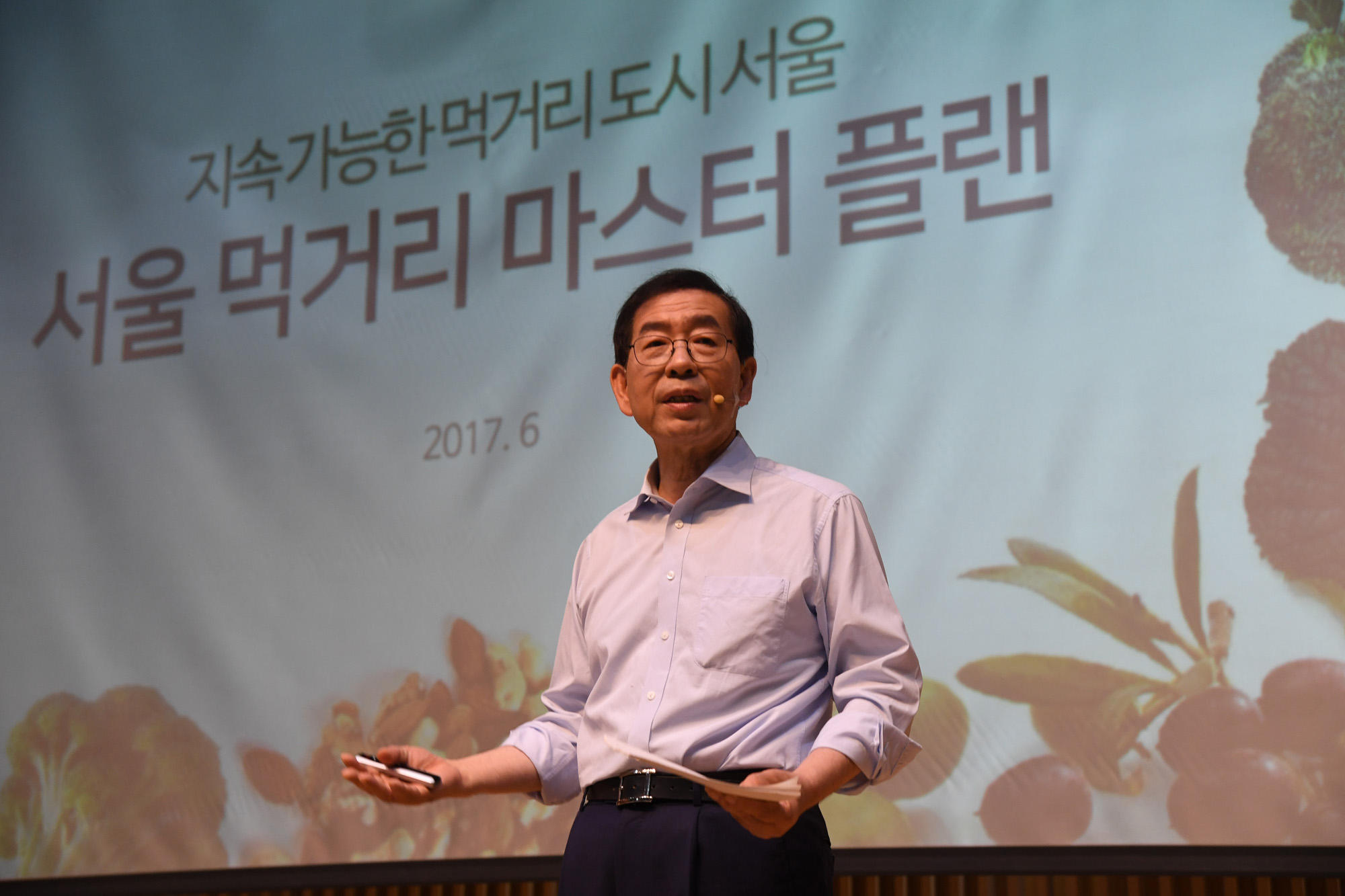 박원순 서울시장이 20일 오전 서울시청사 열린 '시민과 함께하는 서울 먹거리 선언식'에 참석해 서울시민 먹거리 기본권을 선언하고 있다. 서울시 제공