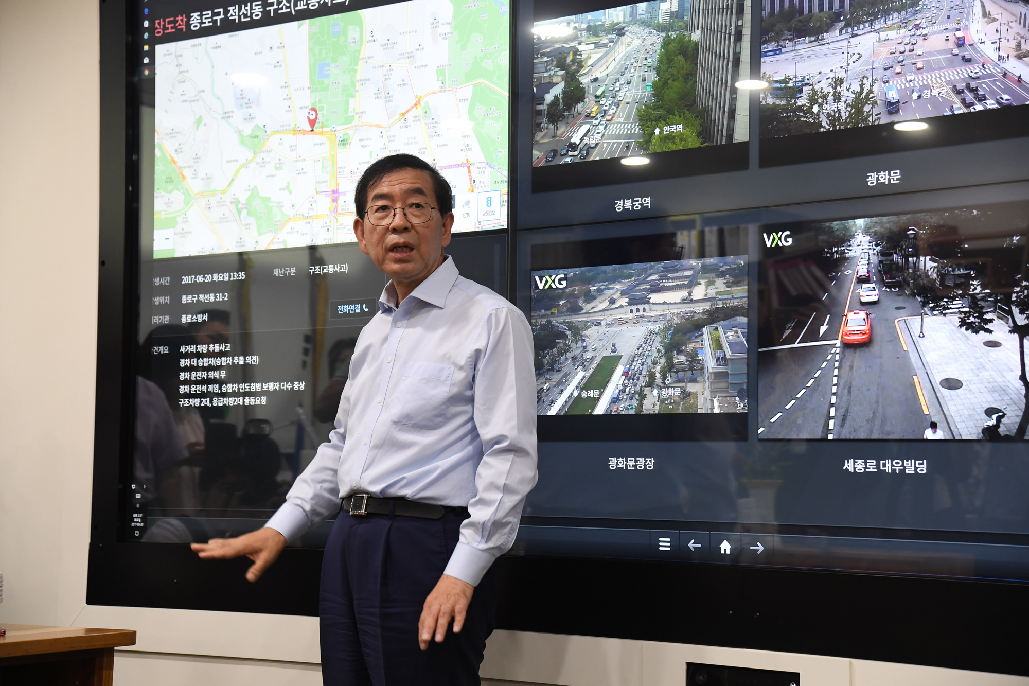 박원순 서울시장이 20일 오후 서울시청 시장실 내에 설치된 '디지털 시민시장실'에서 시연회를 하고 있다. 서울시 제공