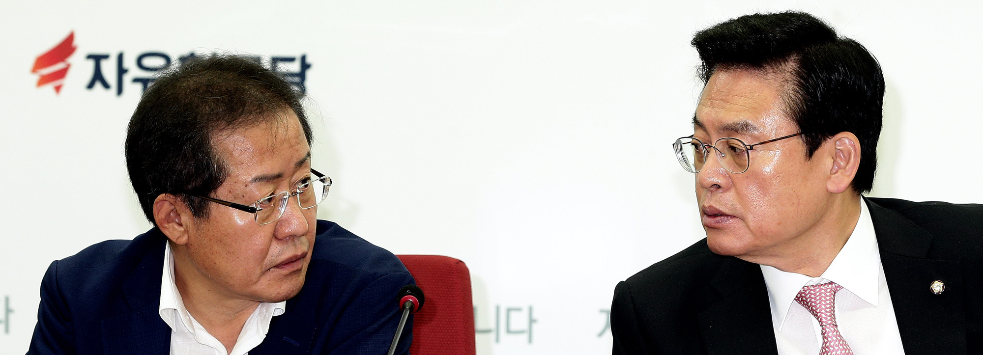 [eoimage=서울] 박은숙 기자 = 준표 자유한국당 대표와 정우택 원내대표가 4일 오전 서울 여의도 당사에서 열린 최고위원회의에서 환하게 웃으며 이야기를 나누고 있다. . 2017.07.05 .eomaster@eoimage.com