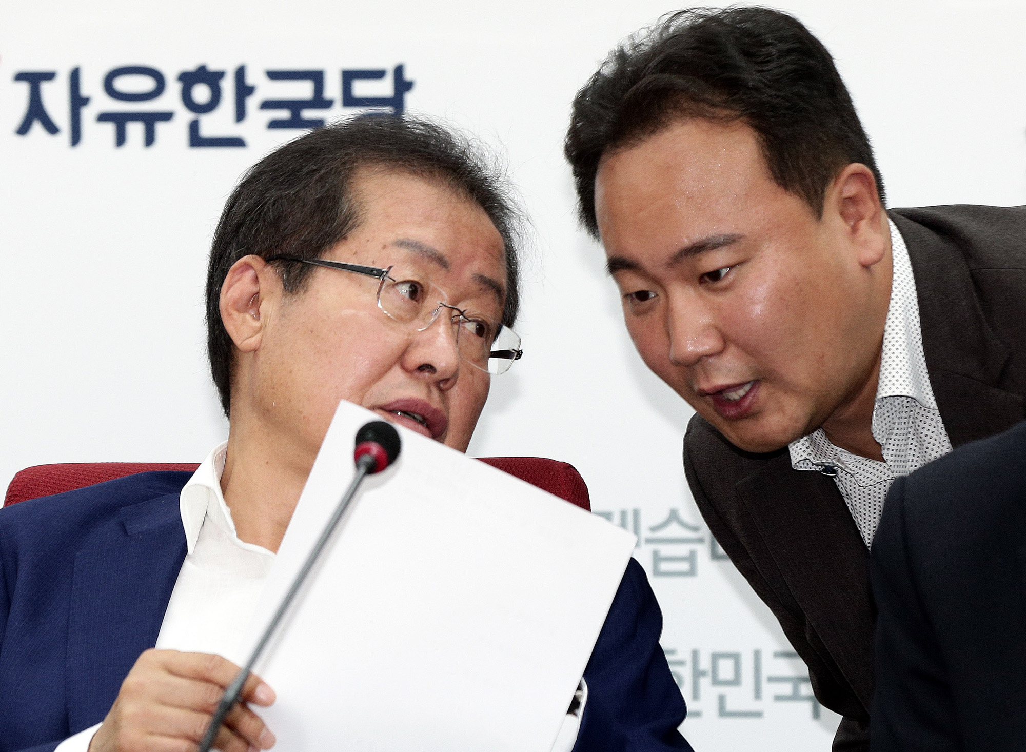 [eoimage=서울] 박은숙 기자 =자유한국당 홍준표 대표가 4일 오전 여의도 당사에서 열린 최고위원회의에서 당관계자와 이야기를 나누고 있다. . 2017.07.05 .eomaster@eoimage.com