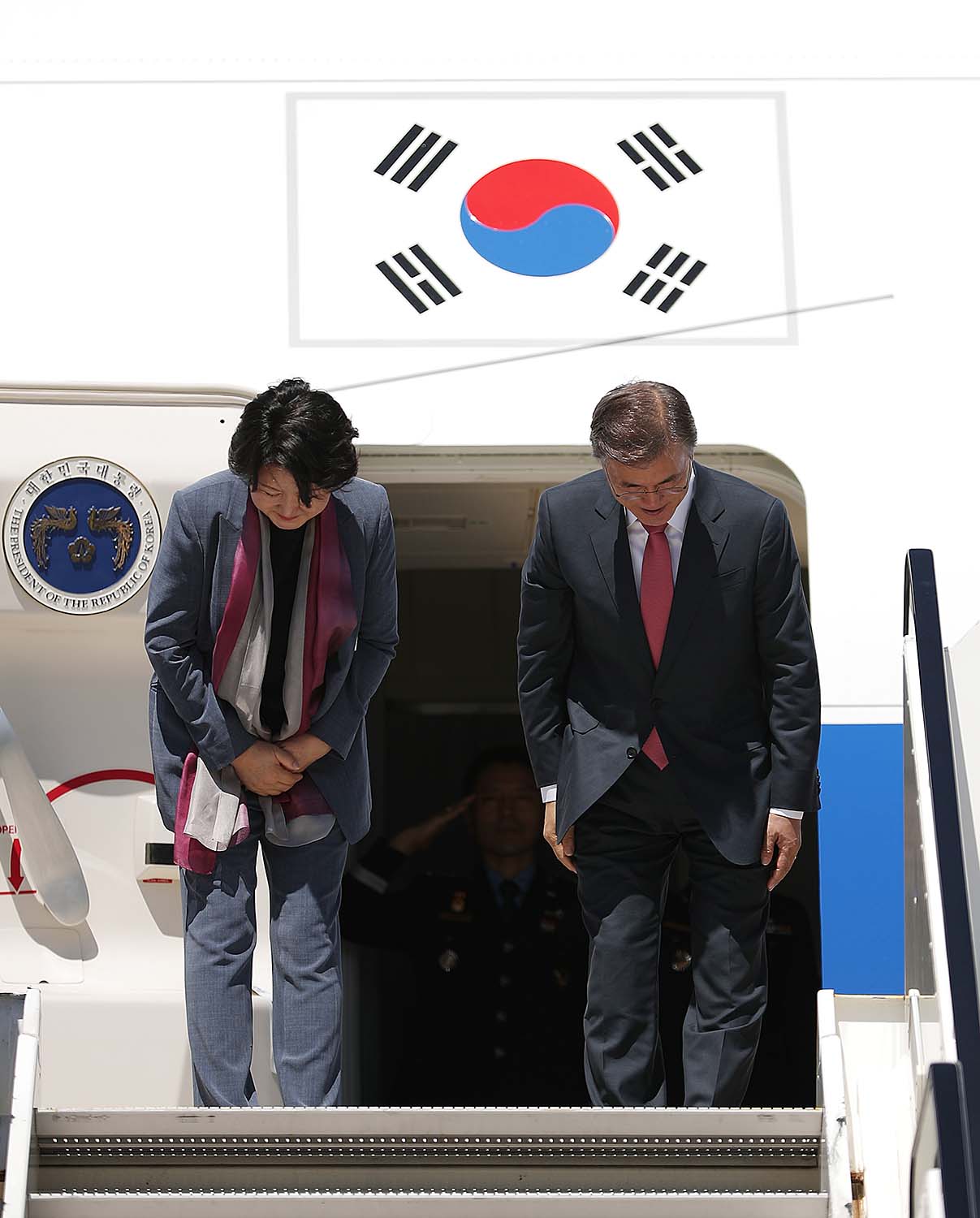 문재인 대통령 부인 김정숙 여사가 9일 오후(현지시간) 독일 공식방문 및 주요 20개국(G20) 정상회의를 마치고 함부르크 헬무트 슈미트 공항을 통해 귀국길에 오르고 있다. 2017.7.9 사진/ 청와대제공