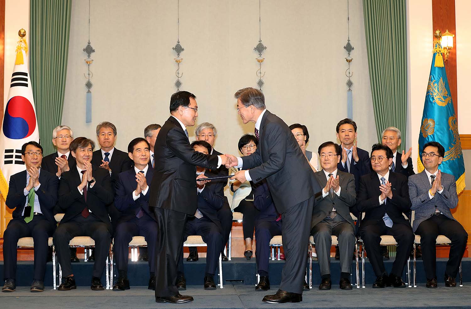 문재인 대통령이 13일 오후 청와대 본관 충무실에서 유영민 신임 미래창조과학부 장관에게 임명장을 수여하고 있다.2017.7.13 사진/ 청와대제공