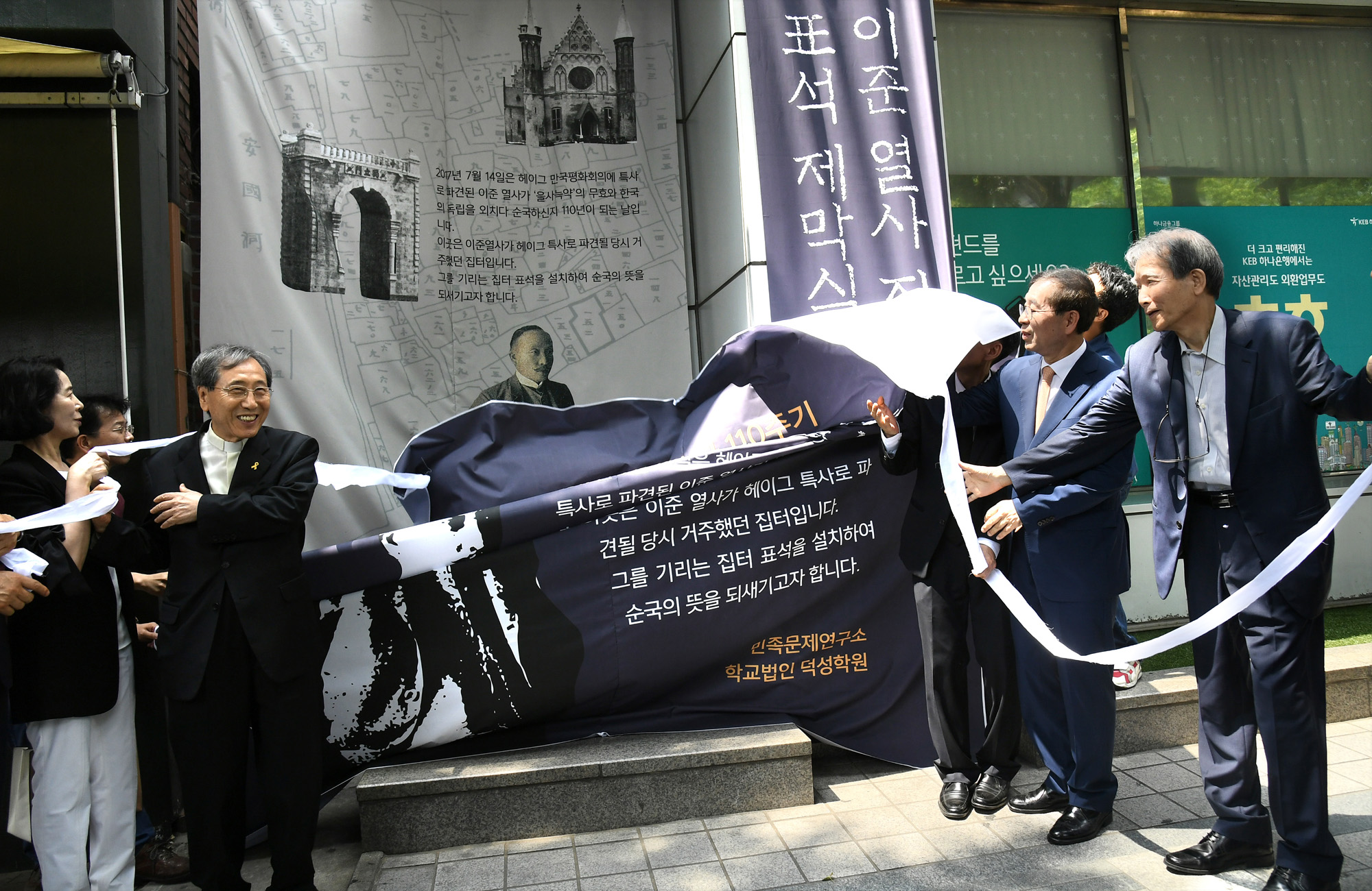 박원순 서울시장이 이준 열사 서거 110주기를 맞아 서울 안국동 집터에 설치된 표석 제막식에 참석하고 있다. 서울시 제공
