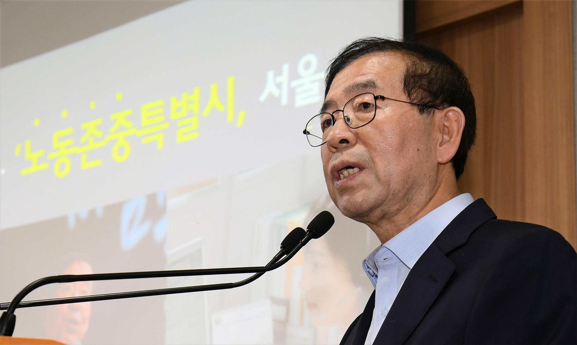 | 사진설명 | 17일 박원순 서울시장은 ‘노동존중특별시 2단계 발전계획’을 발표하는 자리에서 “노동이 존중받는 사회를 만들려면 노동자를 제대로 불러야 한다”며 정부에 “법령과 행정규칙 등 공적인 모든 영역에서 근로자 대신 노동자로 부를 것”을 제안했다. 이날 박 시장은 “서울시를 모델로 노동자 지위를 대폭 향상하기를 바란다”는 취지에서 정규직화·생활임금 등 부문에서 정부안보다 한단계 나아간 것으로 보이는 정책들을 발표했다. 서울시 제공 |