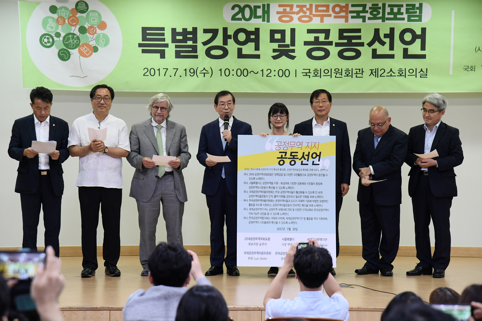 박원순 서울시장이 19일 오전 국회의원회관 제2소회의실에서 열린 공정무역 지지 공동선언식에서 서명하고 있다. 서울시 제공